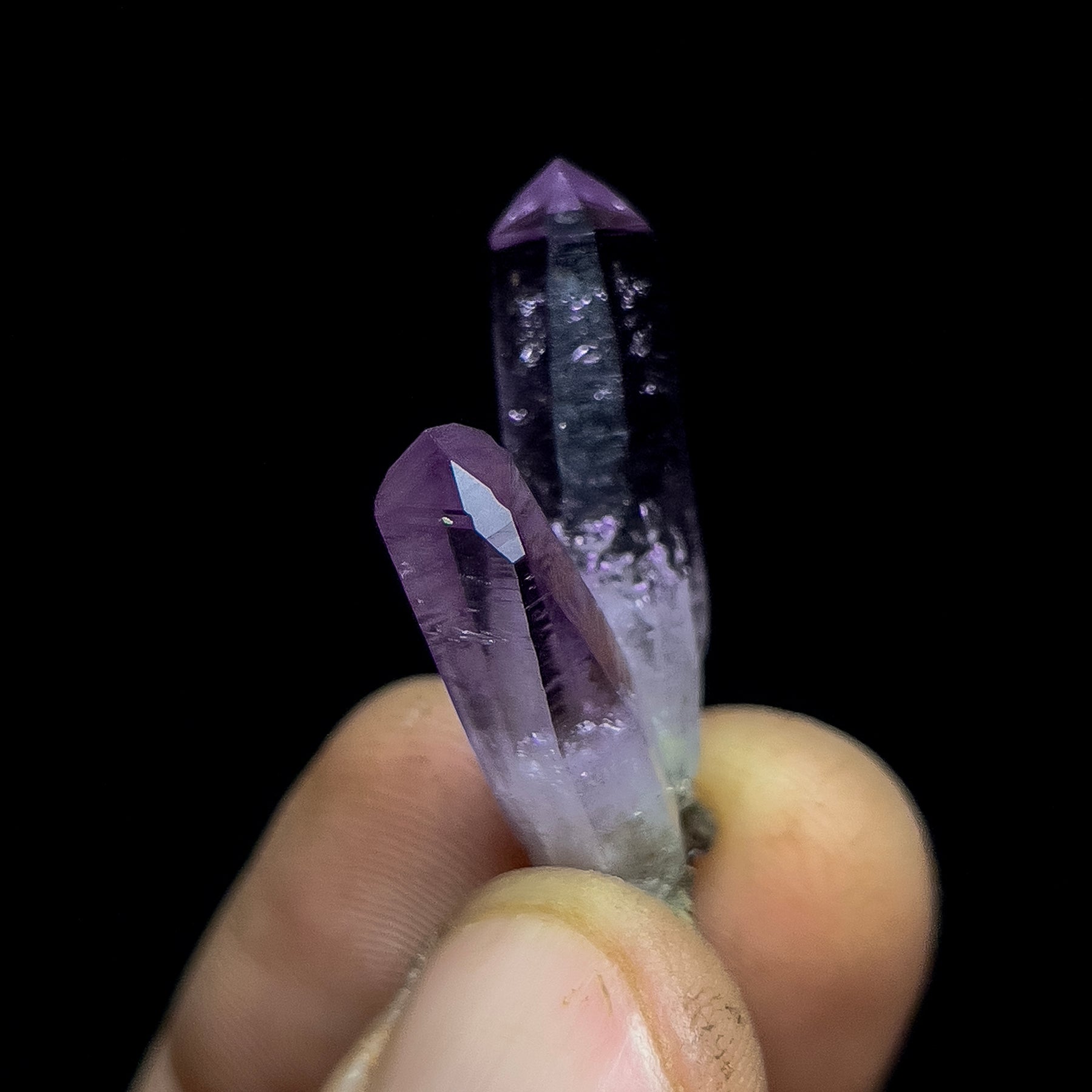 A beautiful amethyst on matrix from the Purple Ninja Pocket, Piedra Parada, Tatatila Municipality, Veracruz, Mexico. This specimen features two prominent amethyst crystals that have grown together in a V-shape cluster. The crystals are sharp, glassy and have a nice purple color that shows phantoms. The specimen is in good condition overall, with no significant damage worth mentioning.