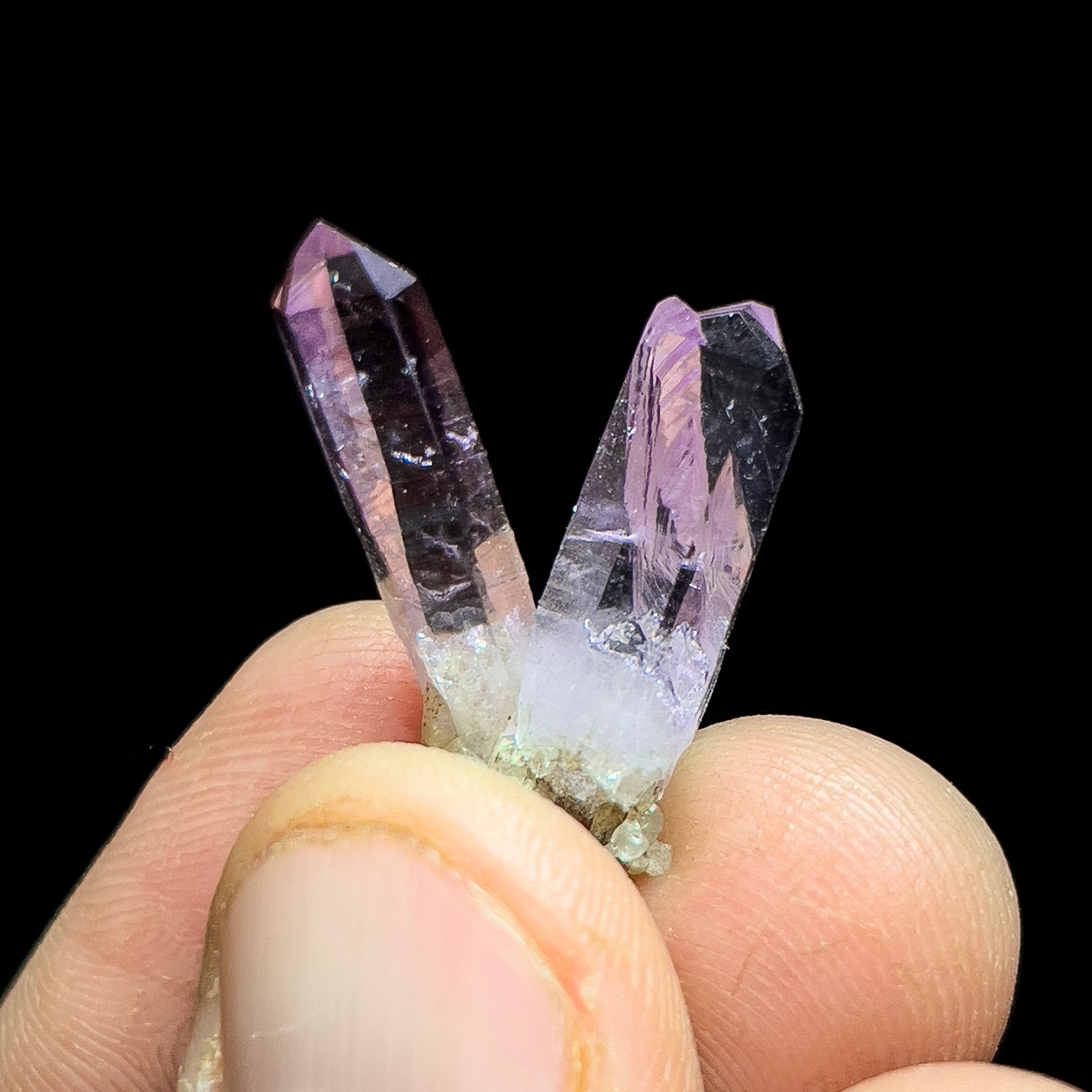 A beautiful amethyst cluster from the Purple Ninja Pocket, Piedra Parada, Tatatila Municipality, Veracruz, Mexico. This specimen features two small amethyst crystals that have grown together in a V-shaped formation. The crystals are gem-quality and exhibit phantoms. The right crystal is contacted on the backside, but the specimen is good condition overall.