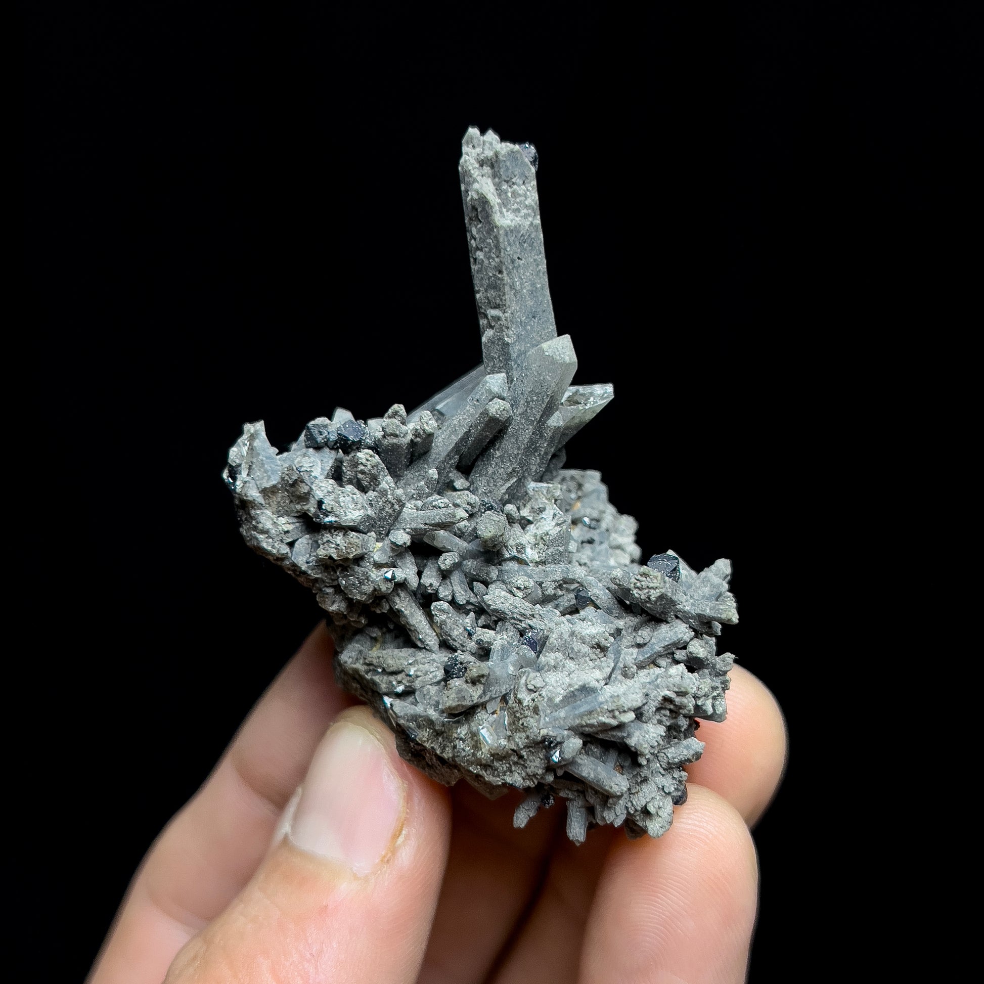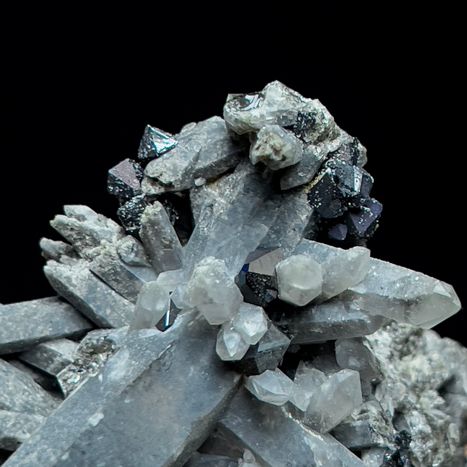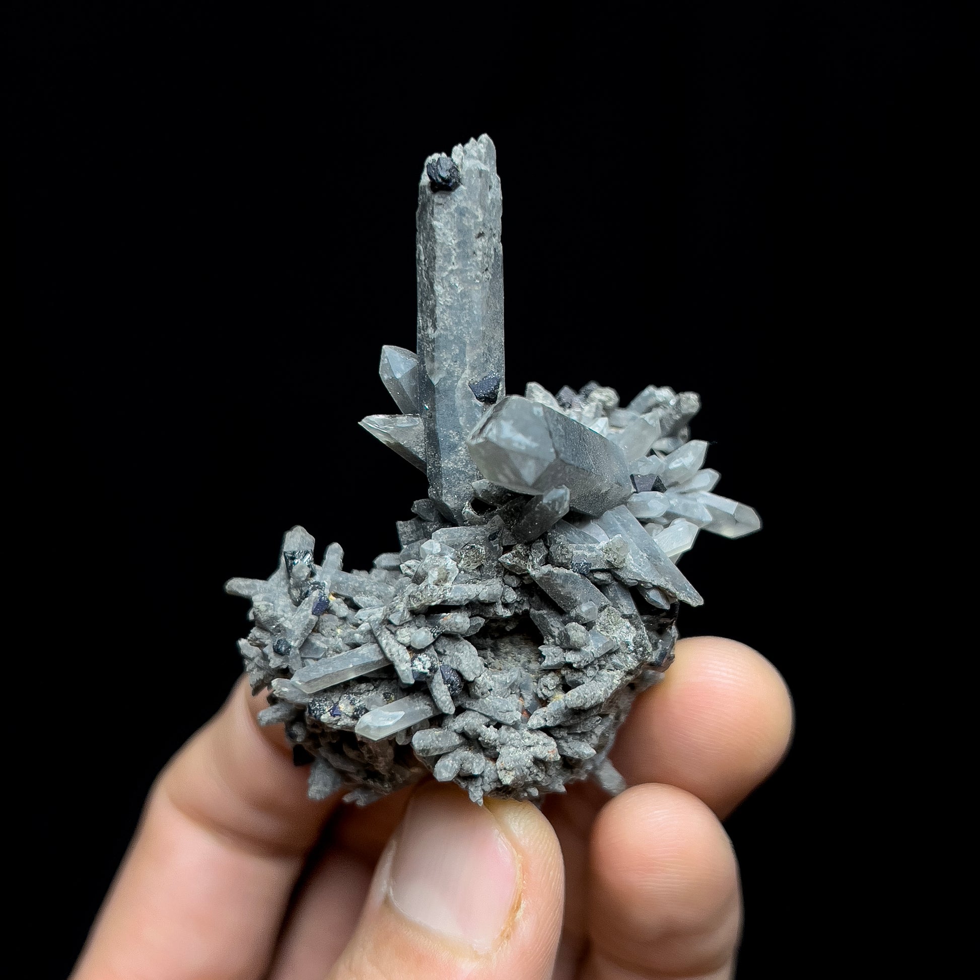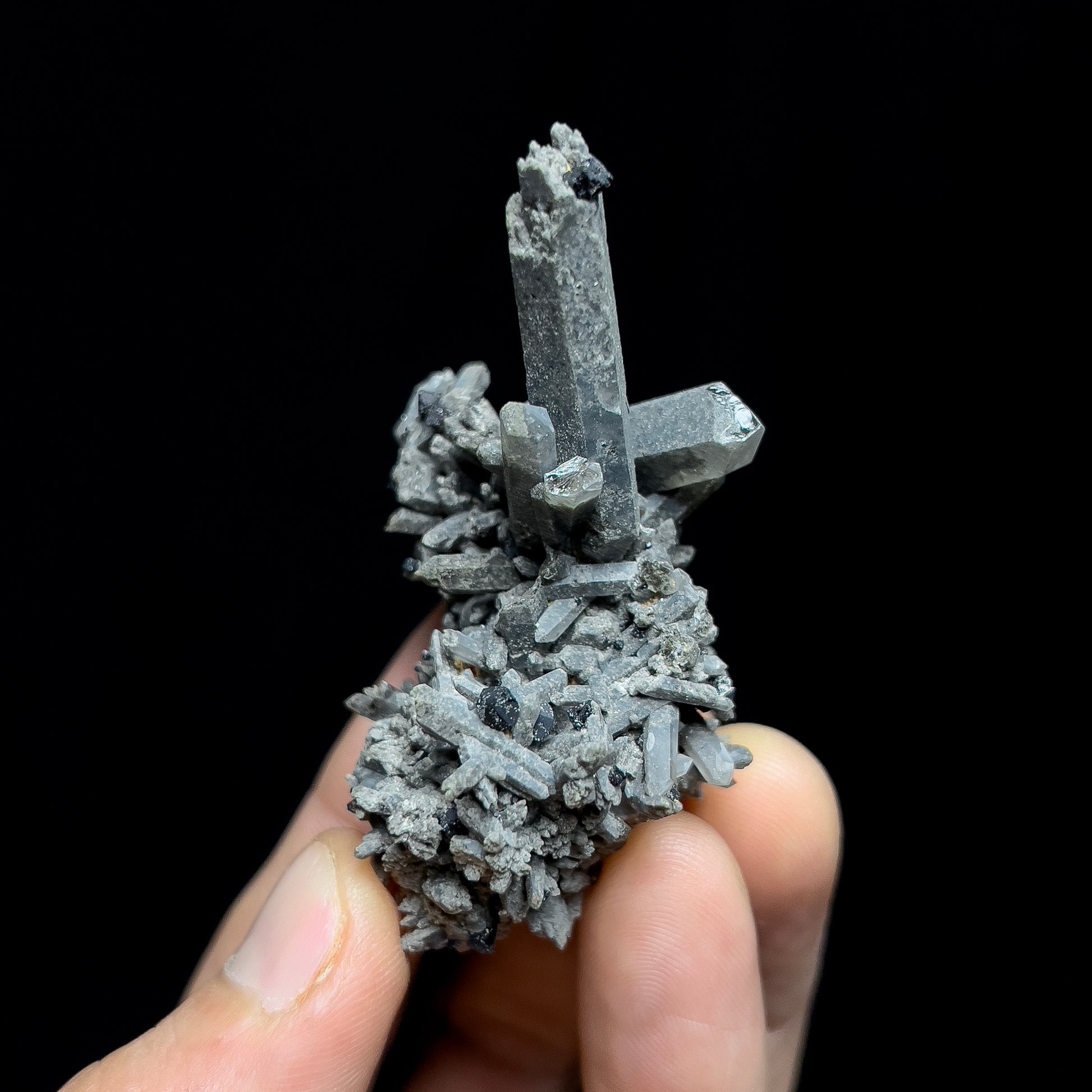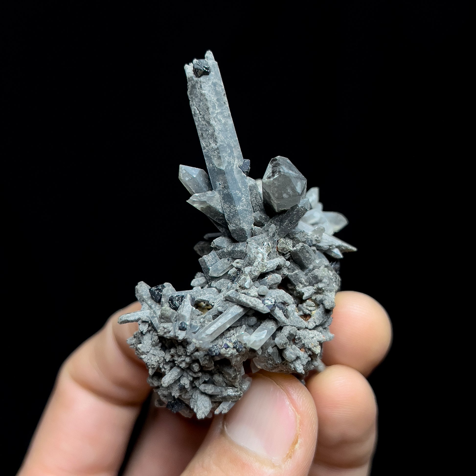 A very nice smoky quartz cluster with brookite crystals from recent production at Moses Hill, in Magnet Cove, in Hot Spring Co., Arkansas. This specimen features numerous smoky quartz crystals of varying sizes that have formed together in a cluster. Two larger, prominent crystals stick up from the group, drawing your eye. Perched on these and the surrounding smaller crystals are jet-black crystals of brookite, a rare titanium mineral. The specimen is in good condition overall but there are a few broken crystals that are showing their roots and one of the larger crystals has a tip ding.