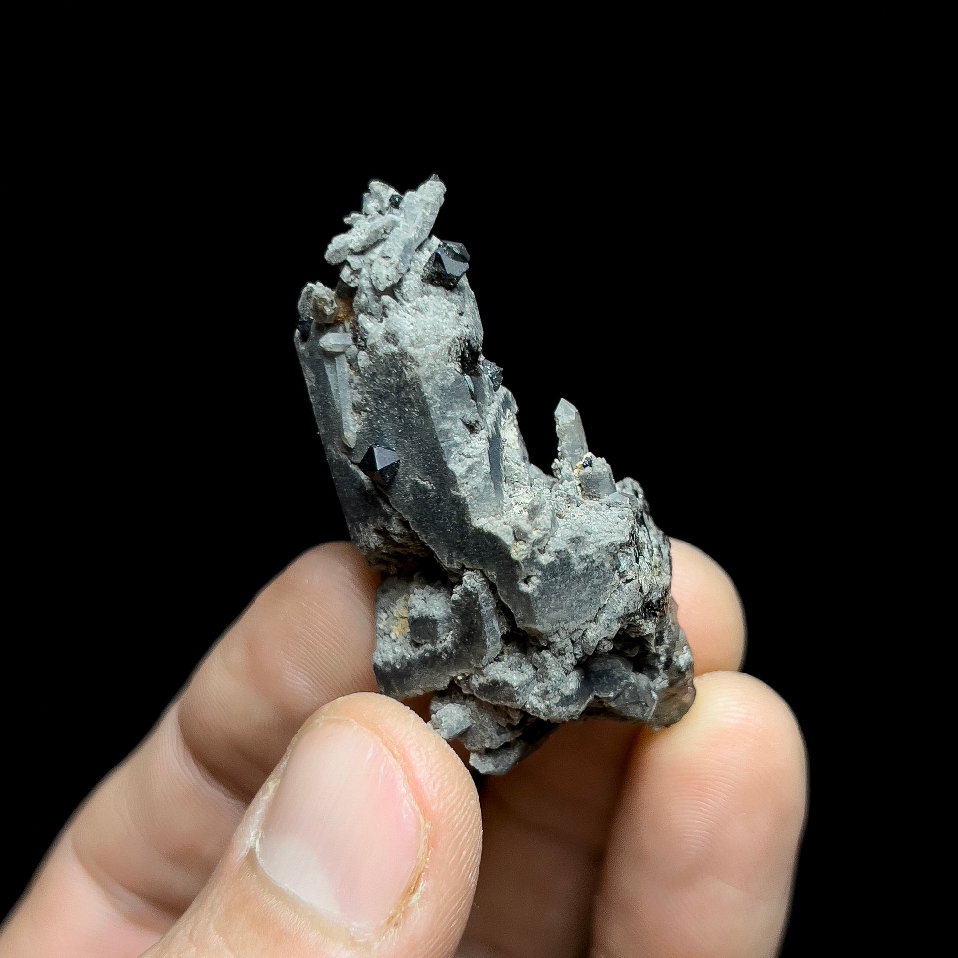 A very nice smoky quartz cluster with brookite crystals from recent production at Moses Hill, in Magnet Cove, in Hot Spring Co., Arkansas. This specimen features an etched smoky quartz crystal with alternating gemmy and opaque zones that hosts sharp, jet-black brookite crystals. Brookite is a rare titanium mineral that is found at Magnet Cove in superb quality. This piece shows numerous small brookites that have formed on the quartz. It is in good condition with no major damage to report.