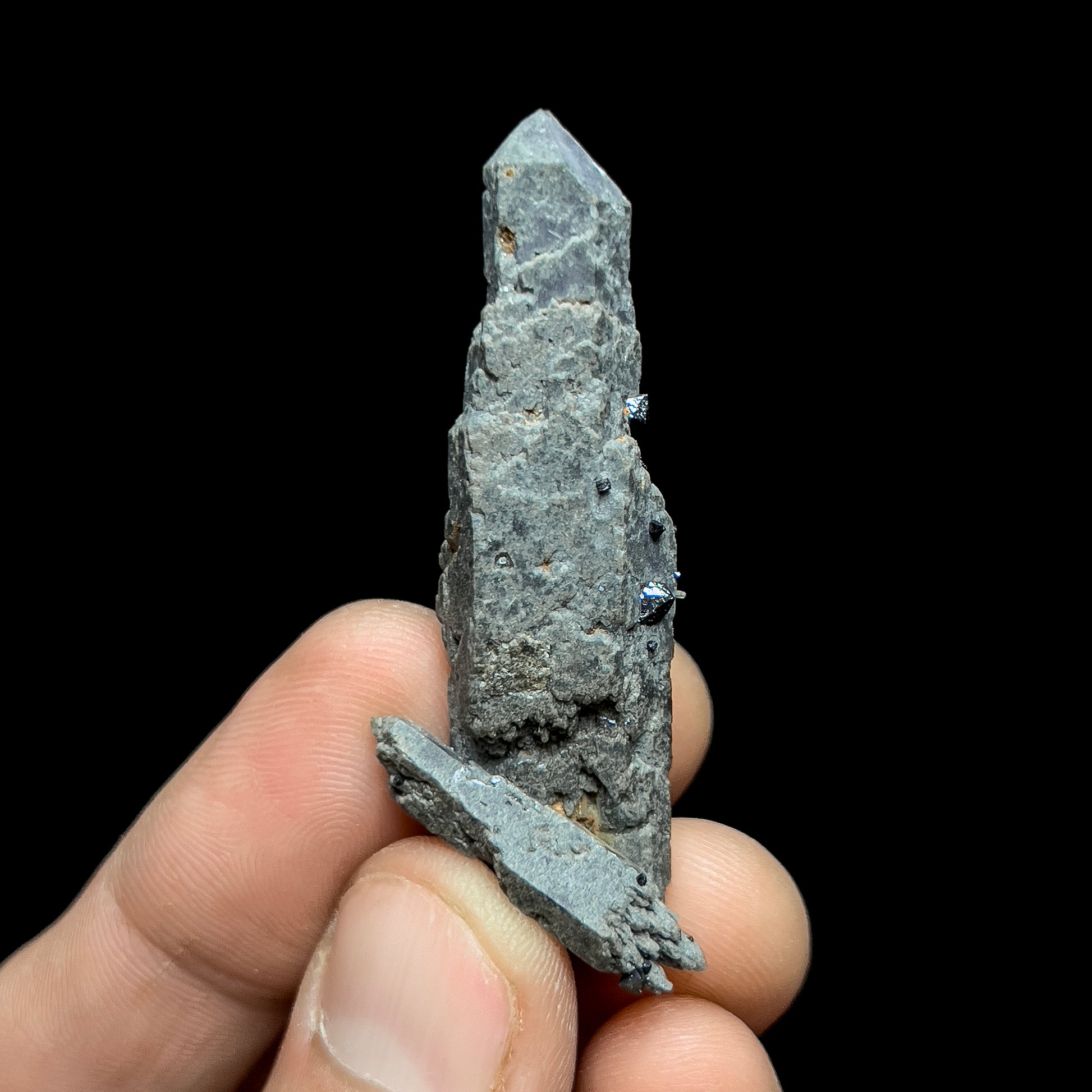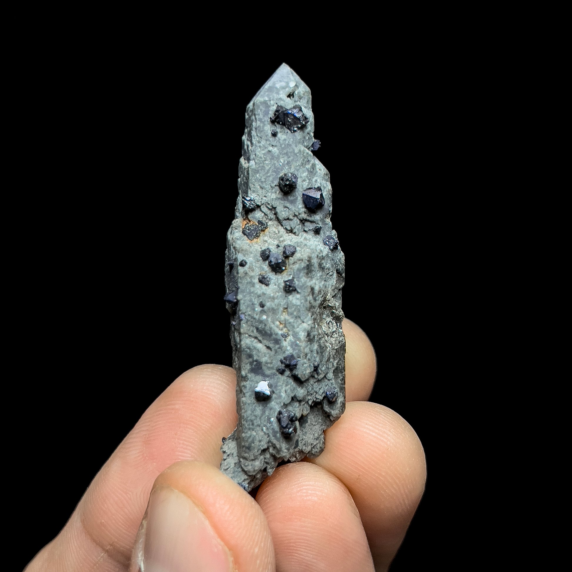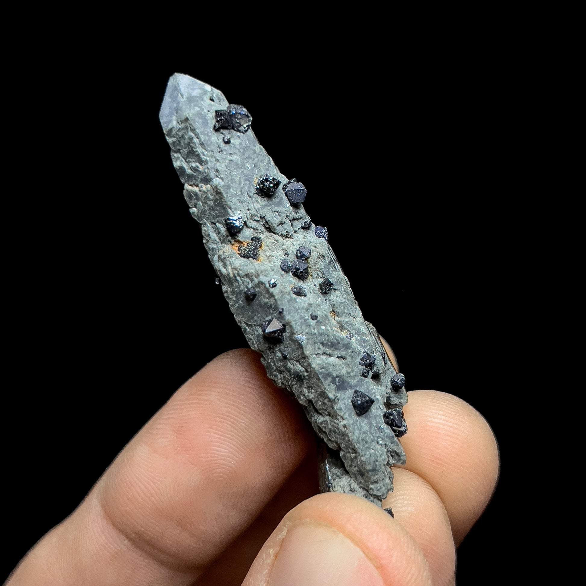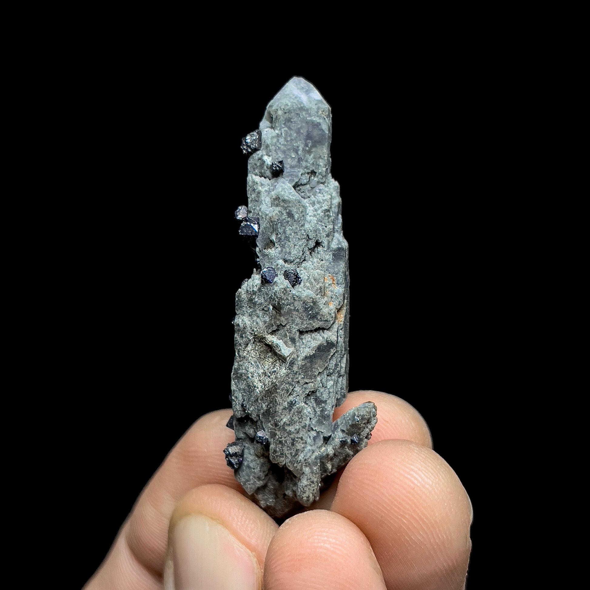 A very nice smoky quartz crystal with brookite from recent production at Moses Hill, in Magnet Cove, in Hot Spring Co., Arkansas. This specimen features an etched, grey smoky quartz crystal that hosts numerous sharp, jet-black brookite crystals. Brookite is a rare titanium mineral that is found at Magnet Cove in superb quality and this specimen is a fine example of the material. It is in good condition with no major damage to report.