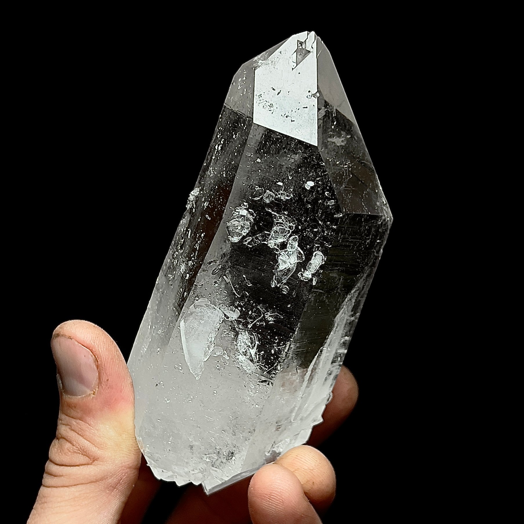 A large, gemmy double terminated quartz crystals with good luster and micro crystals that have grown on the back face. The main termination shows some highly complex faces, while the bottom exhibits a significant "rehealed" termination. Custom mounting is available at checkout.