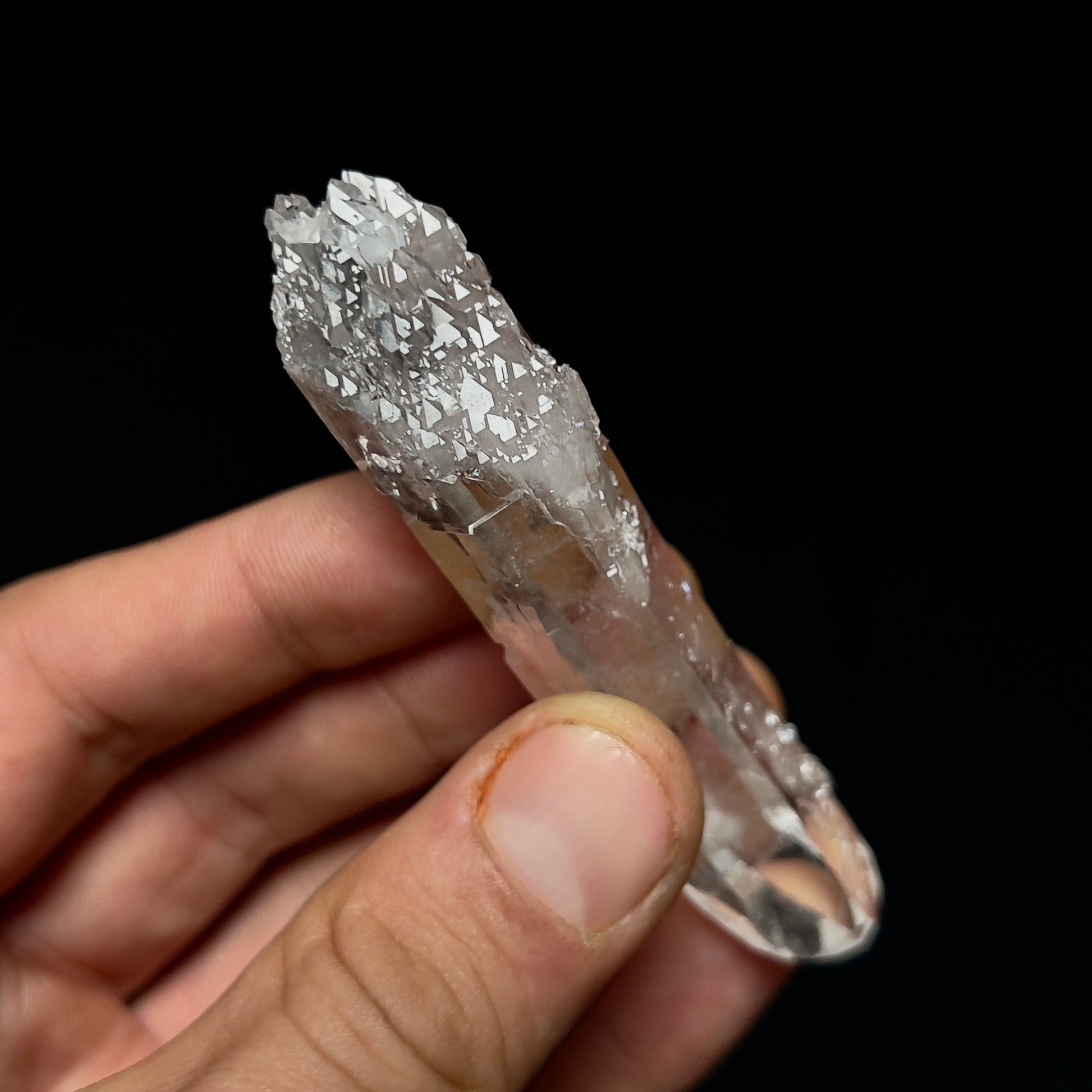 A lovely doubly terminated quartz crystal from I Me Mine, near Jessieville, Arkansas. This gem quartz crystal features a sharp main termination and a very complex, recrystallized (or "rehealed") bottom termination. The crystal has mirror-like luster and great clarity. Custom mounting is available at checkout.