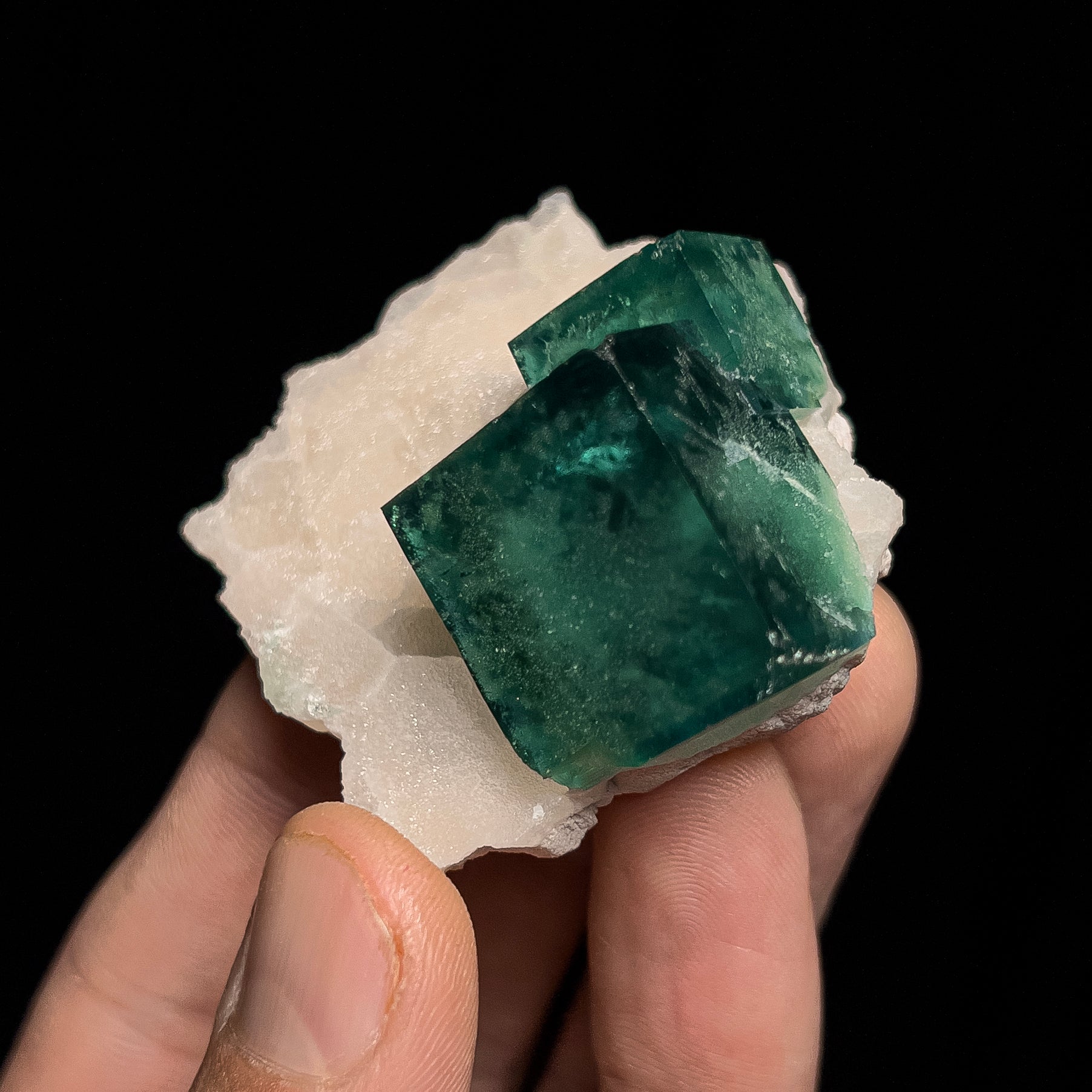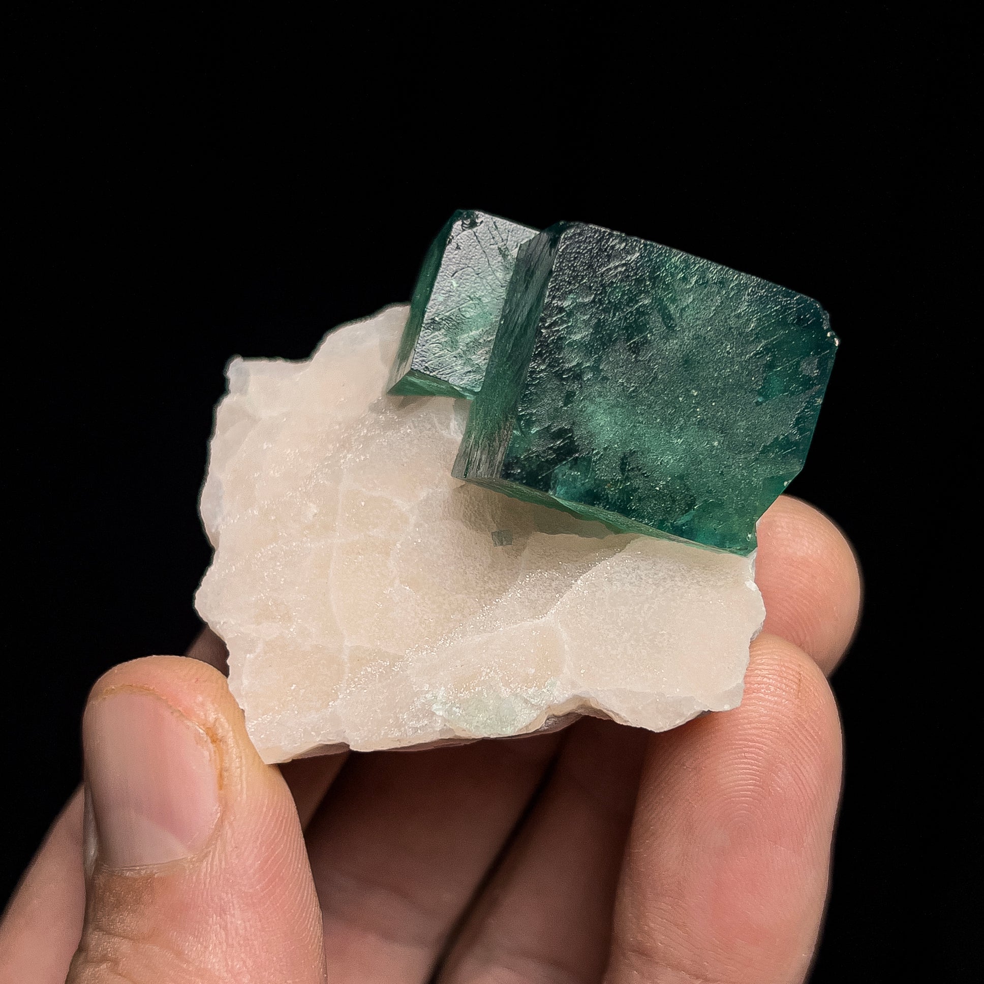 A stunning fluorite specimen on a quartz matrix from Mandrosonoro, Ambatofinandrahana District, Amoron'i Mania, Madagascar. This specimen features two blue-green cubes on a bit of matrix. The fluorite crystals are mostly a green color, with a thin blue zone at or near the surface - this final blueish zone causes an interesting color to the cube as a whole. You end up with a beautiful blue-green hue. The crystals are set on a matrix of off-white drusy quartz that formed over the host rock. This provides excellent contrast between the blue-green fluorite crystals and the off-white quartz matrix. The assemblage is ideal, with the two fluorite cubes perched dramatically atop the matrix - well balanced and super aesthetically pleasing. There is some damage to the fluorites - two corners have small dings and there is some minor edgewear. Custom mounting is available at checkout.