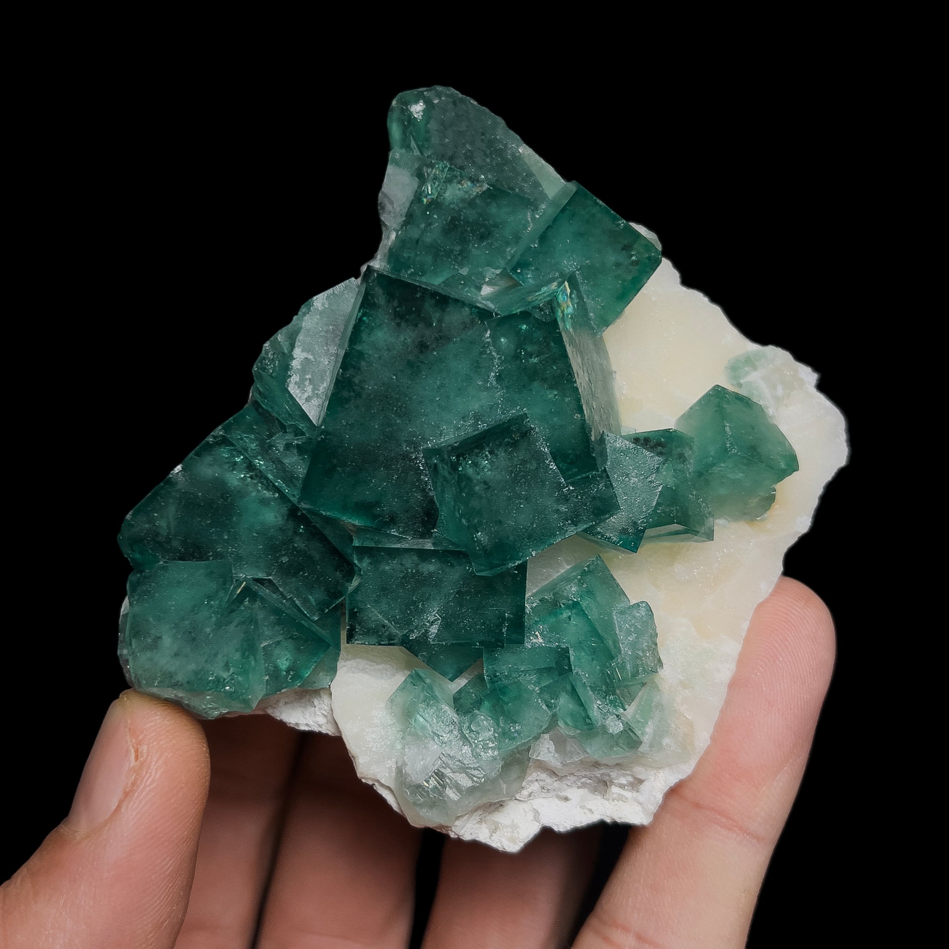 A stunning fluorite specimen on a quartz matrix from Mandrosonoro, Ambatofinandrahana District, Amoron'i Mania, Madagascar. This specimen features an assemblage of fluorite cubes on matrix. The fluorite crystals are mostly a green color, with a thin blue zone at or near the surface - this final blueish zone causes an interesting color to the cube as a whole. You end up with a beautiful blue-green hue. The crystals are set on a matrix of off-white drusy quartz that formed over the host rock. This provides excellent contrast between the blue-green fluorite crystals and the off-white quartz matrix. The assemblage is very aesthetic, although there is some damage - minor edgewear and small dings to corners, as well as several small broken cubes near the bottom. Custom mounting is available at checkout.