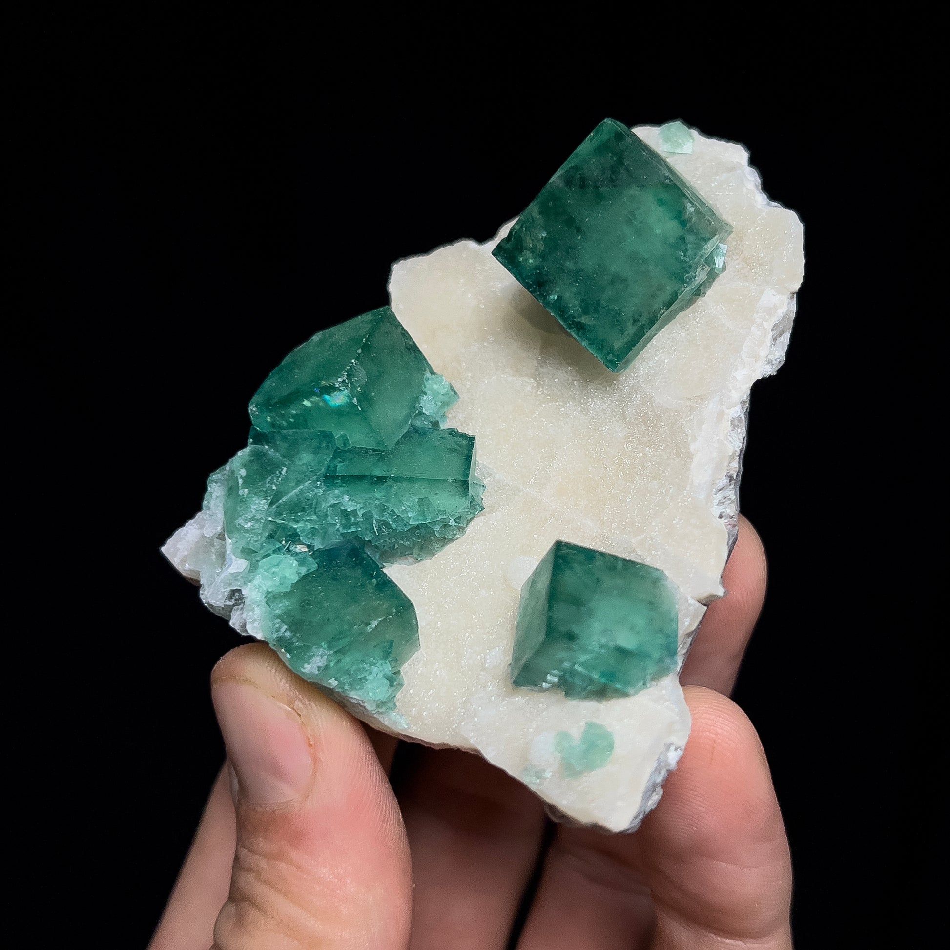 An outstanding fluorite specimen on a quartz matrix from Mandrosonoro, Ambatofinandrahana District, Amoron'i Mania, Madagascar. This specimen features an assemblage of fluorite crystals on a matrix of quartz druse. The fluorite crystals are mostly a green color, with a thin blue zone at or near the surface - this final blueish zone causes an interesting color to the cube as a whole. You end up with a beautiful blue-green hue. The crystals are set on a matrix of off-white drusy quartz that formed over the host rock. This provides excellent contrast between the blue-green fluorite crystals and the off-white quartz matrix. The assemblage is very aesthetic - the fluorite crystals and groups are isolated from one another which gives good depth and composition to the piece. There is some damage - minor edgewear and small dings to corners, as well as several cleaved cubes near the bottom. Custom mounting is available at checkout.