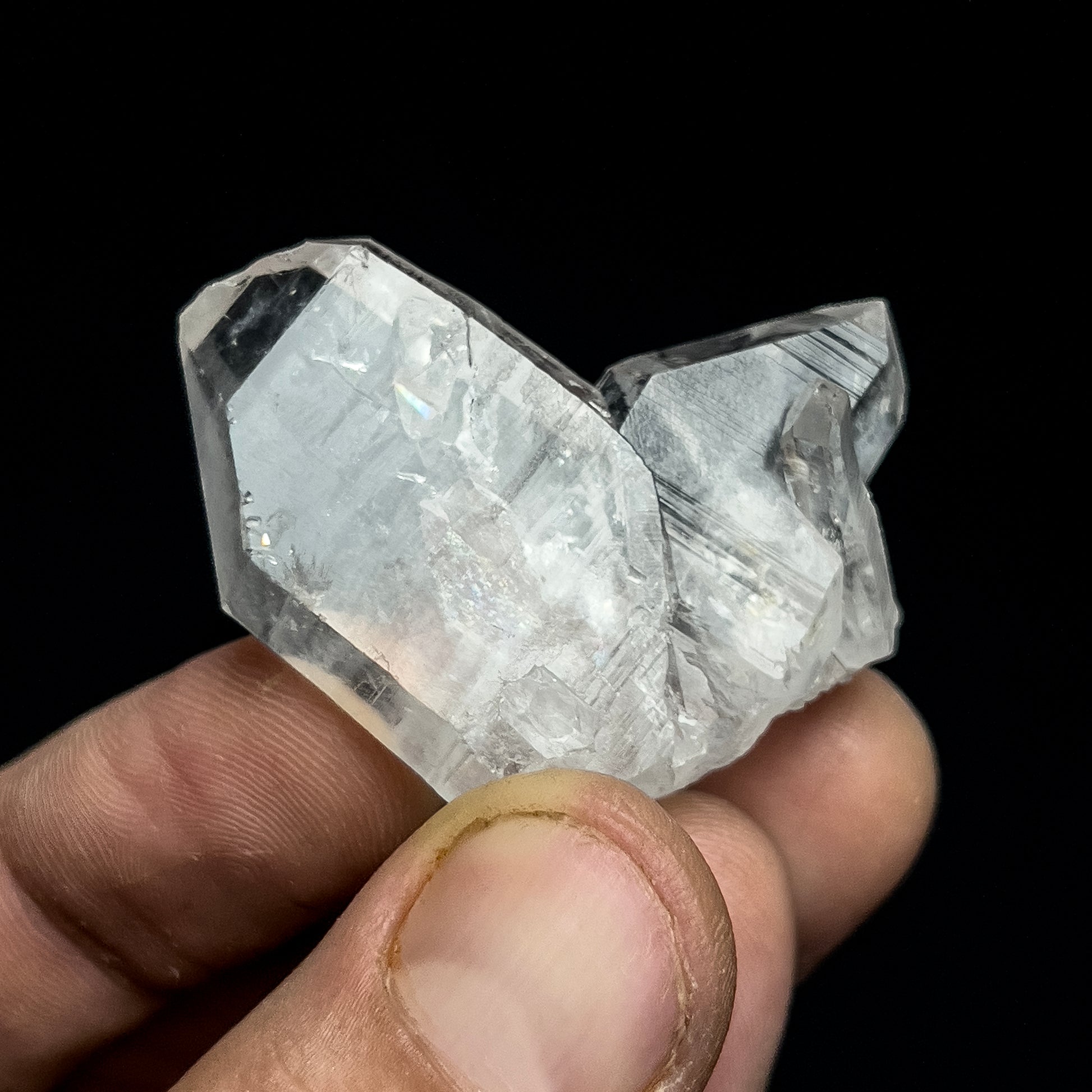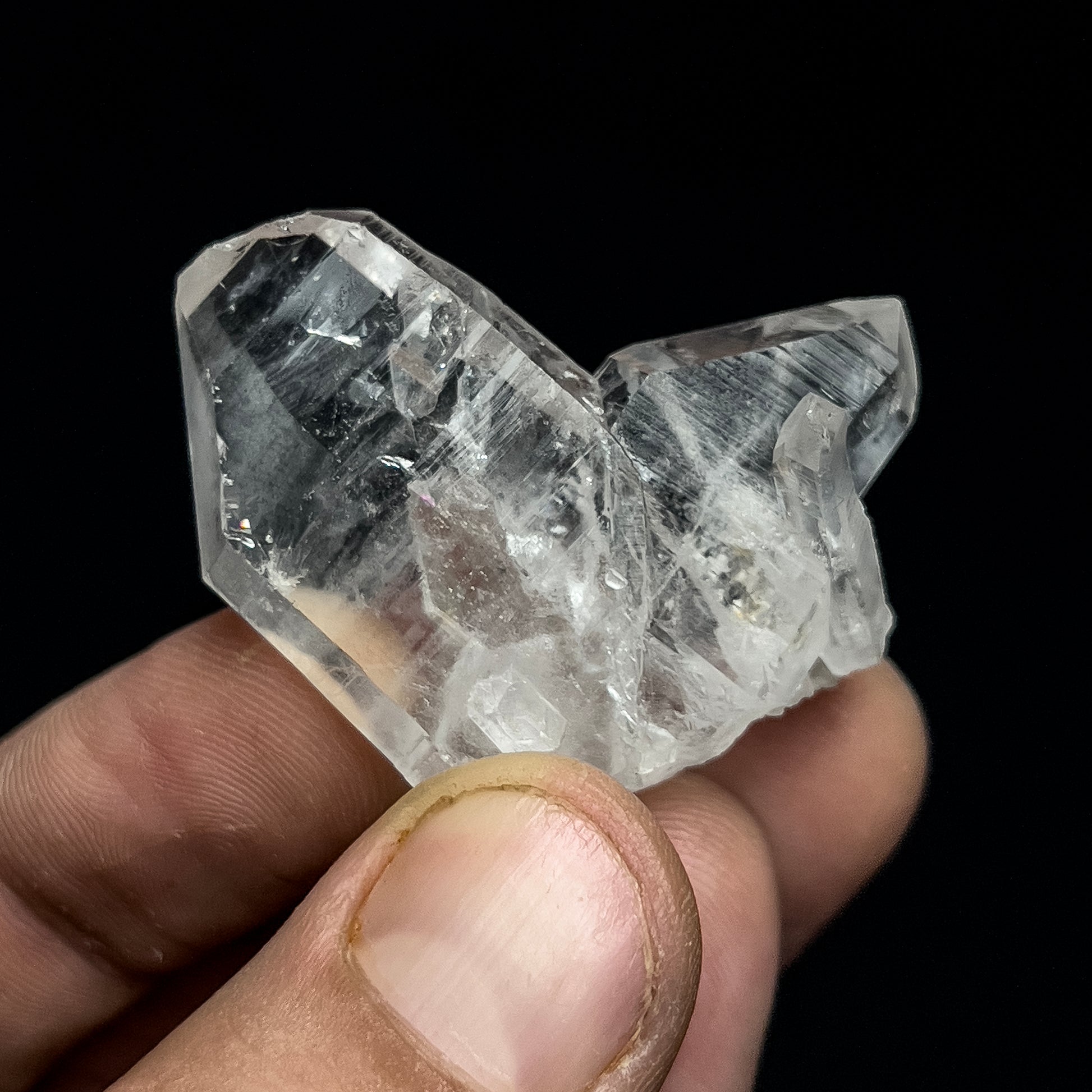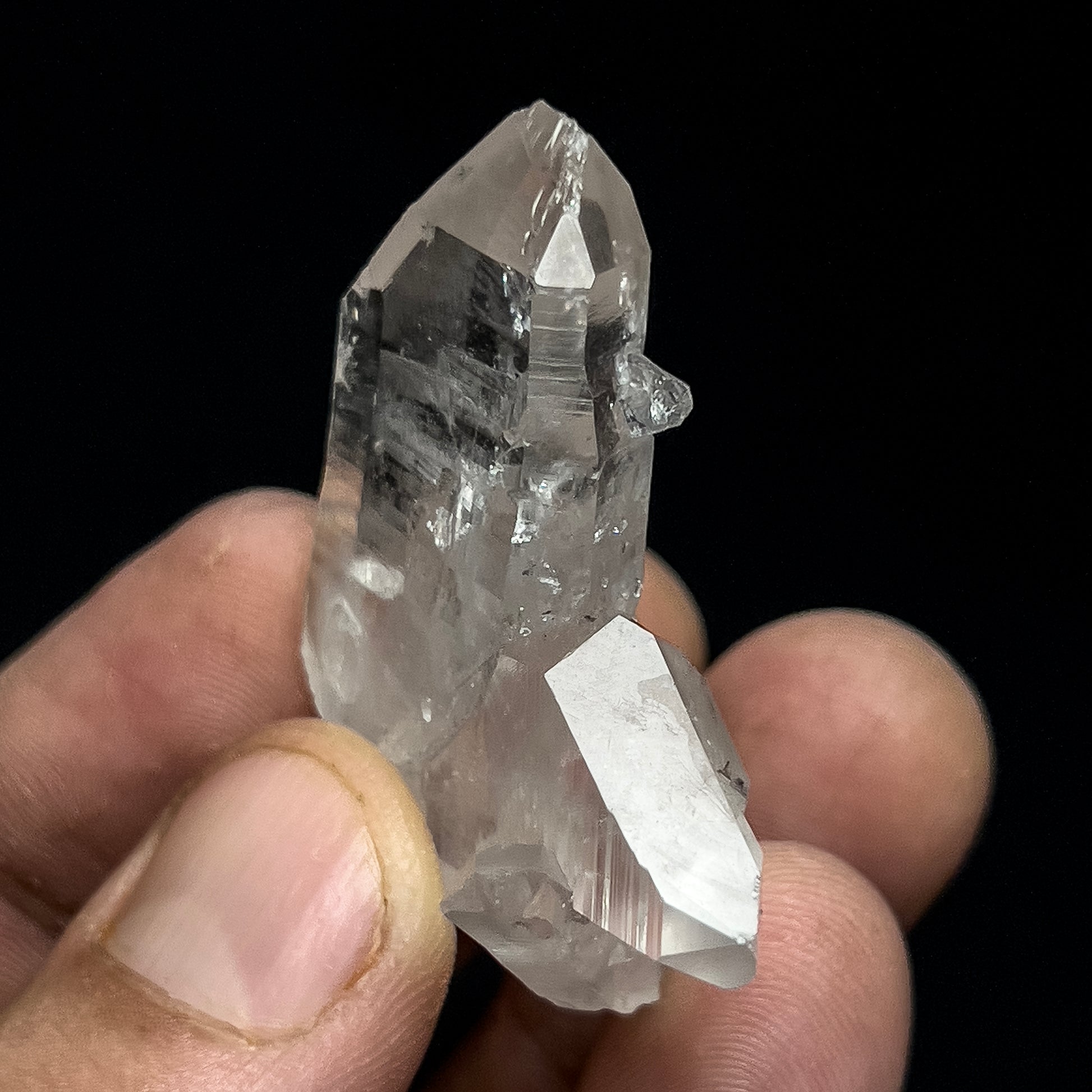 A very nice Japan-law twin quartz crystal from the Collier Creek mine, near Mt. Ida, in Montgomery Co., Arkansas. This crystal is repaird once, right down the twin plane in the middle. It has great form and clarity - a classic tabular, Japan-law twin. Several smaller, prismatic crystals have grown into the twin, which gives the piece a bit of aesthetic appeal, rather than just a single twin. It does have some damage to the left-hand termination of the twin.