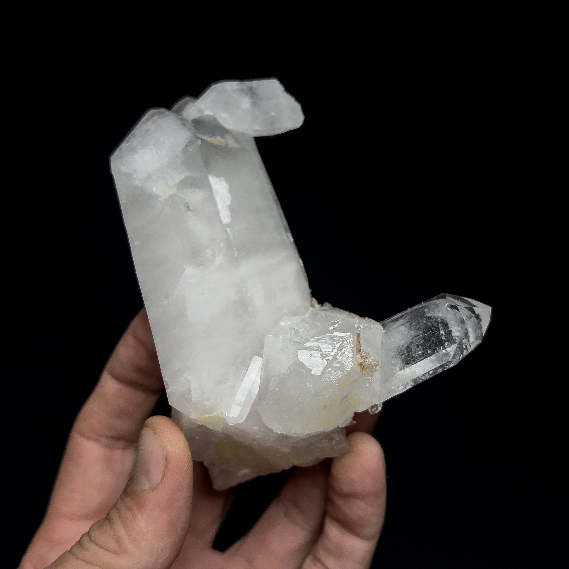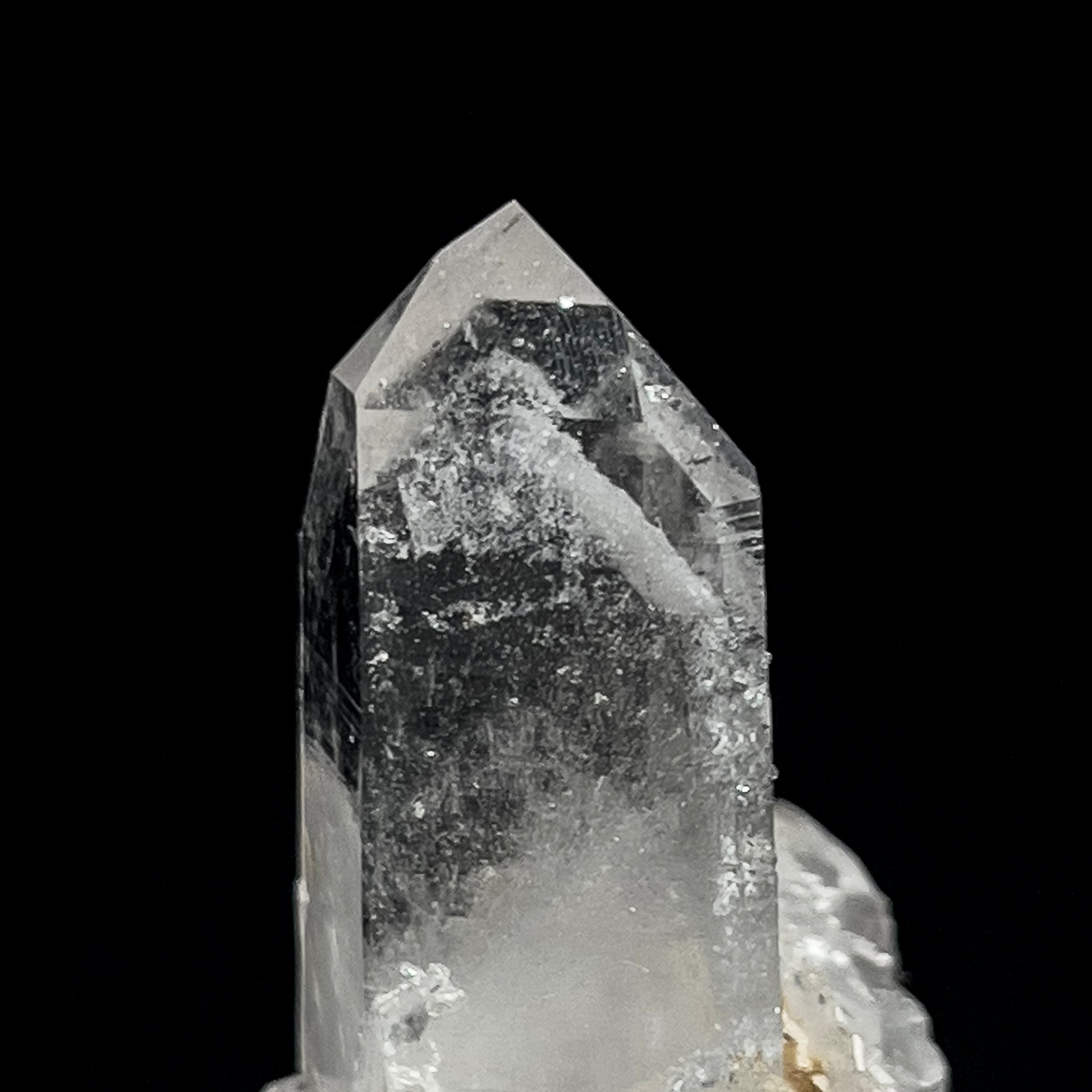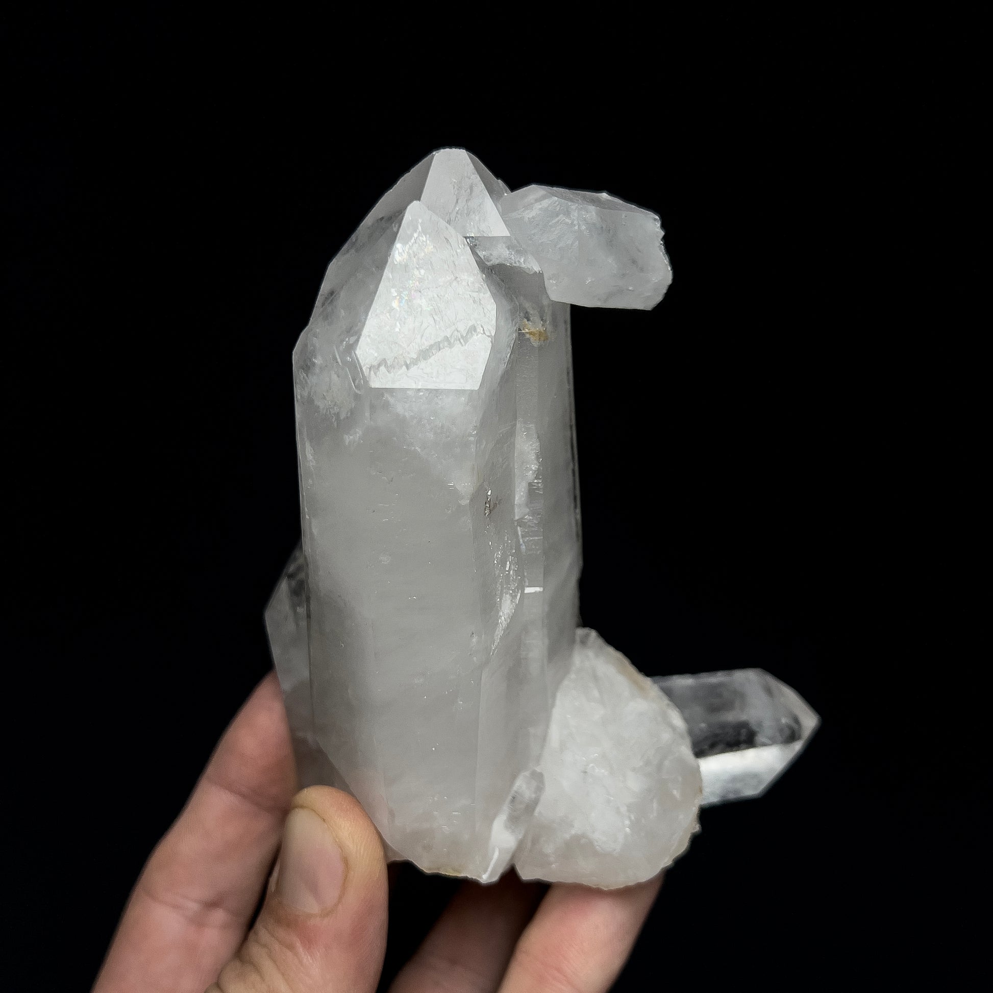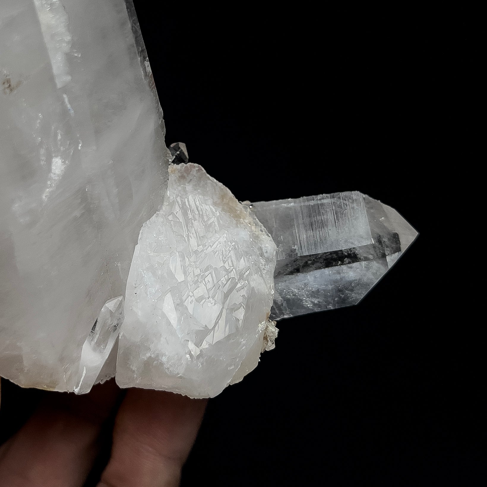 A superb (and very large) Japan-law twin quartz cluster from the Collier Creek Mine, near Mt. Ida, in Montgomery Co., Arkansas. This monster twin measures nearly 5 inches across and has a white phantom in the smaller gemmy crystal - this crystal is repaired back on unfortunately but that keeps the price down significantly. The larger crystal exhibits good parallel-growth and the twin hosts several other smaller crystals. The entire piece is completely crystallized all the way around, making it a full floater with no true point of attachment. Some of these are recrystallized areas so it did not form as a floater, but rather recrystallized on broken areas while mineralizing solution was still present in the pocket. The piece is in fair condition overall - aside from the repair there is some chatter on the termination of the largest crystal, as well as one small broken crystal with the root showing on the front of the specimen. Custom mounting is available at checkout.