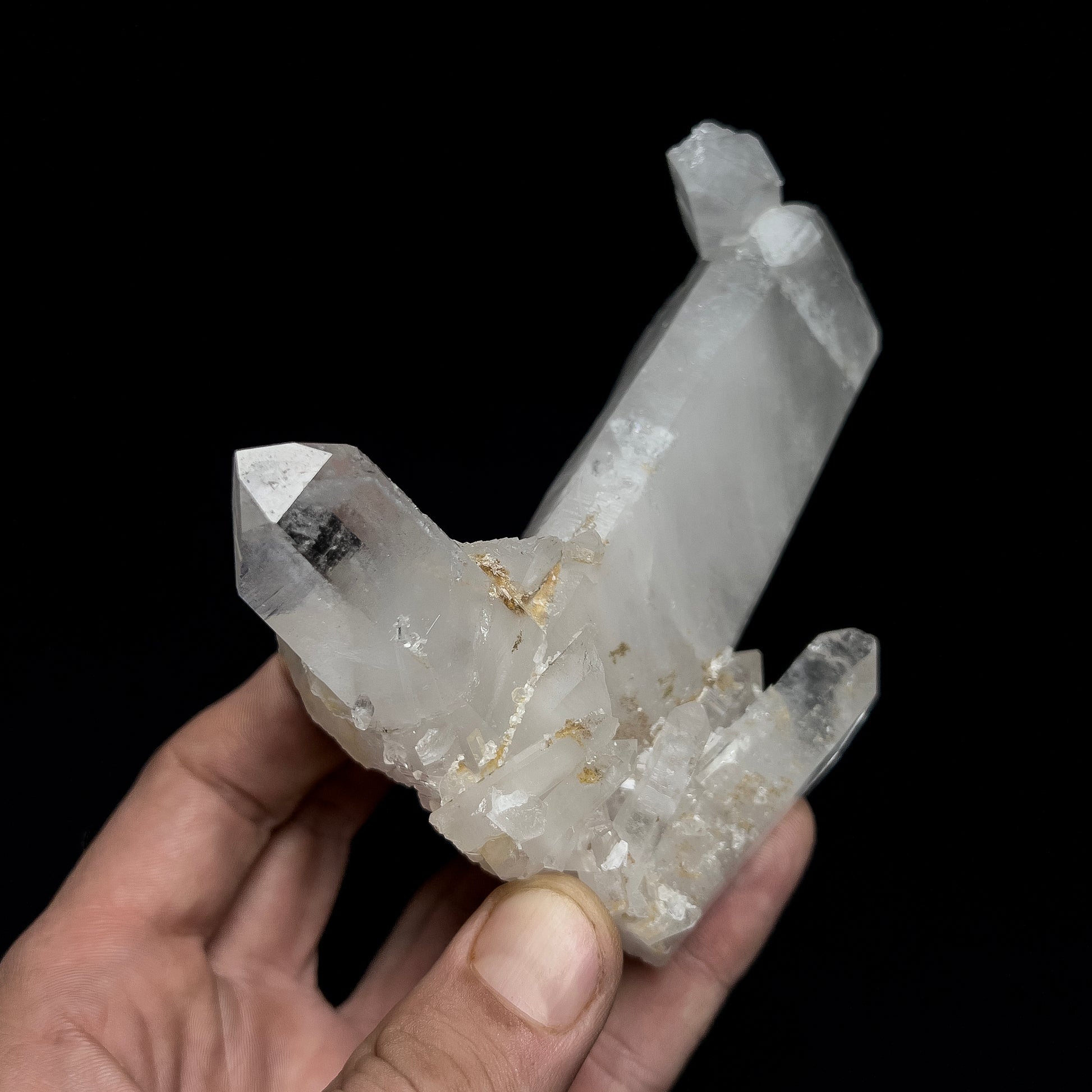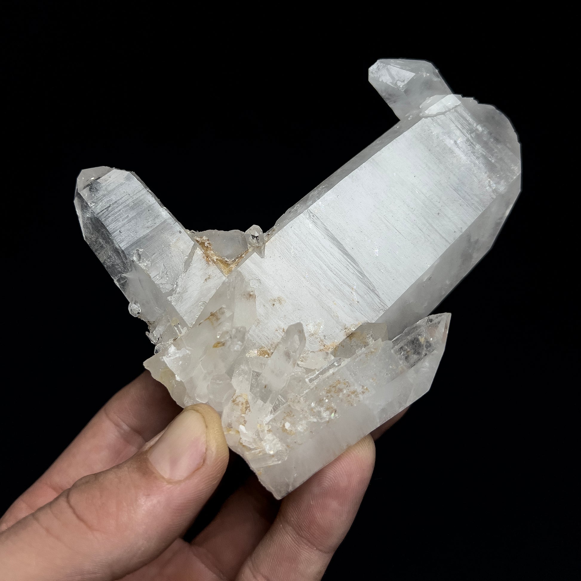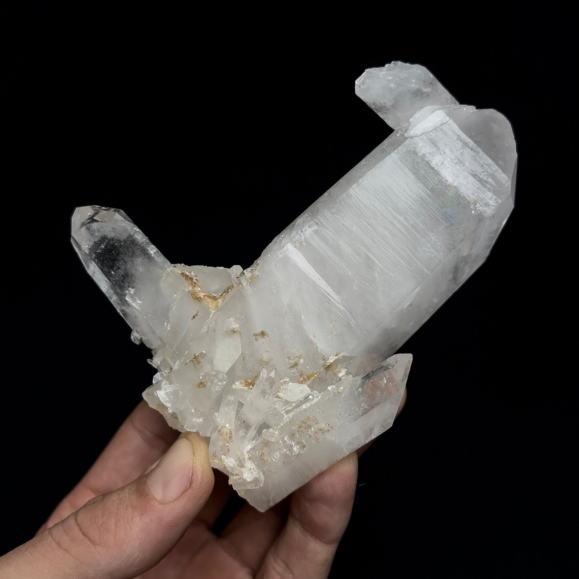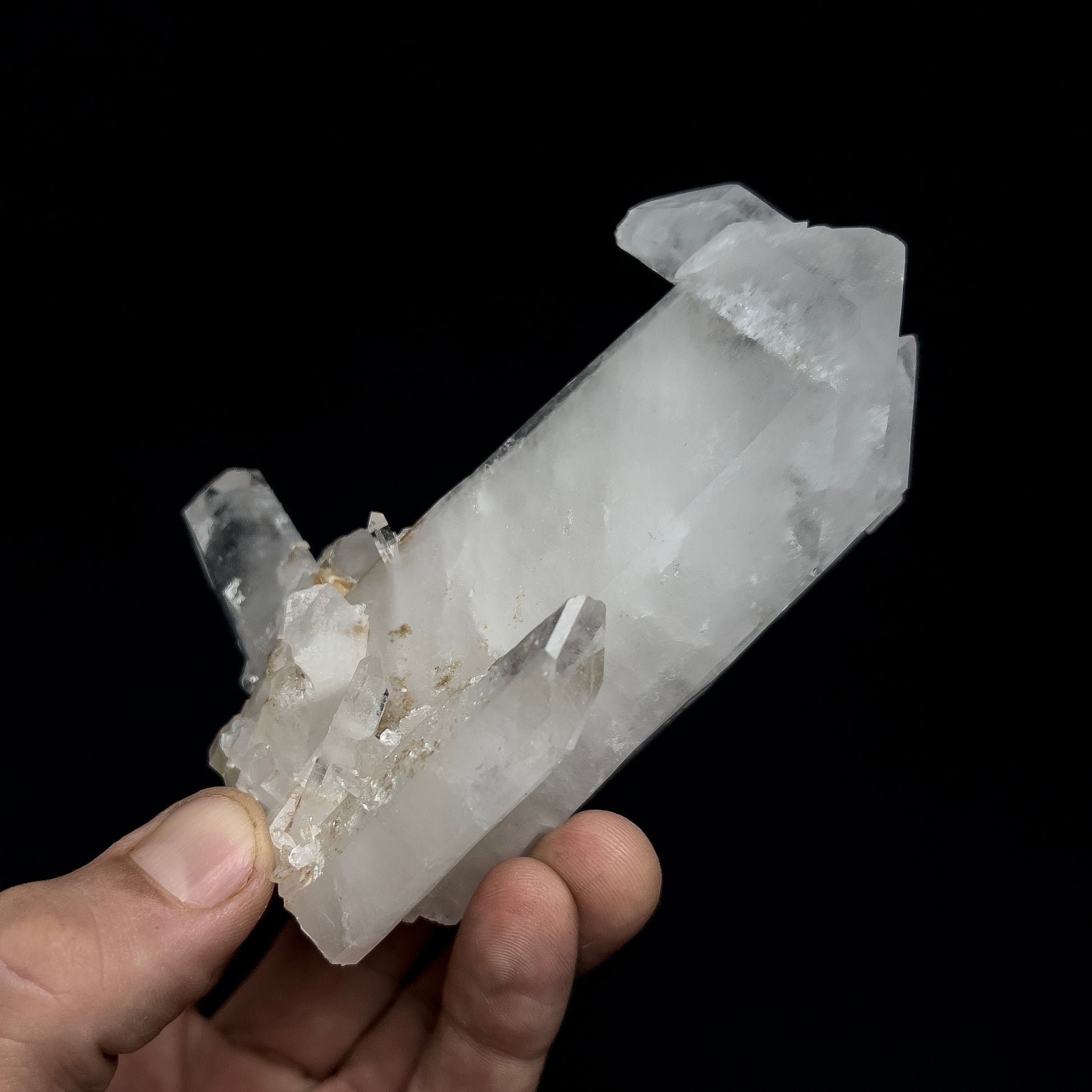A superb (and very large) Japan-law twin quartz cluster from the Collier Creek Mine, near Mt. Ida, in Montgomery Co., Arkansas. This monster twin measures nearly 5 inches across and has a white phantom in the smaller gemmy crystal - this crystal is repaired back on unfortunately but that keeps the price down significantly. The larger crystal exhibits good parallel-growth and the twin hosts several other smaller crystals. The entire piece is completely crystallized all the way around, making it a full floater with no true point of attachment. Some of these are recrystallized areas so it did not form as a floater, but rather recrystallized on broken areas while mineralizing solution was still present in the pocket. The piece is in fair condition overall - aside from the repair there is some chatter on the termination of the largest crystal, as well as one small broken crystal with the root showing on the front of the specimen. Custom mounting is available at checkout.