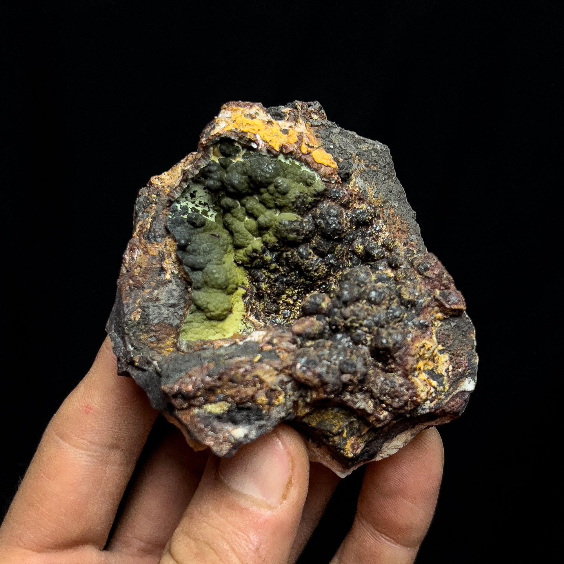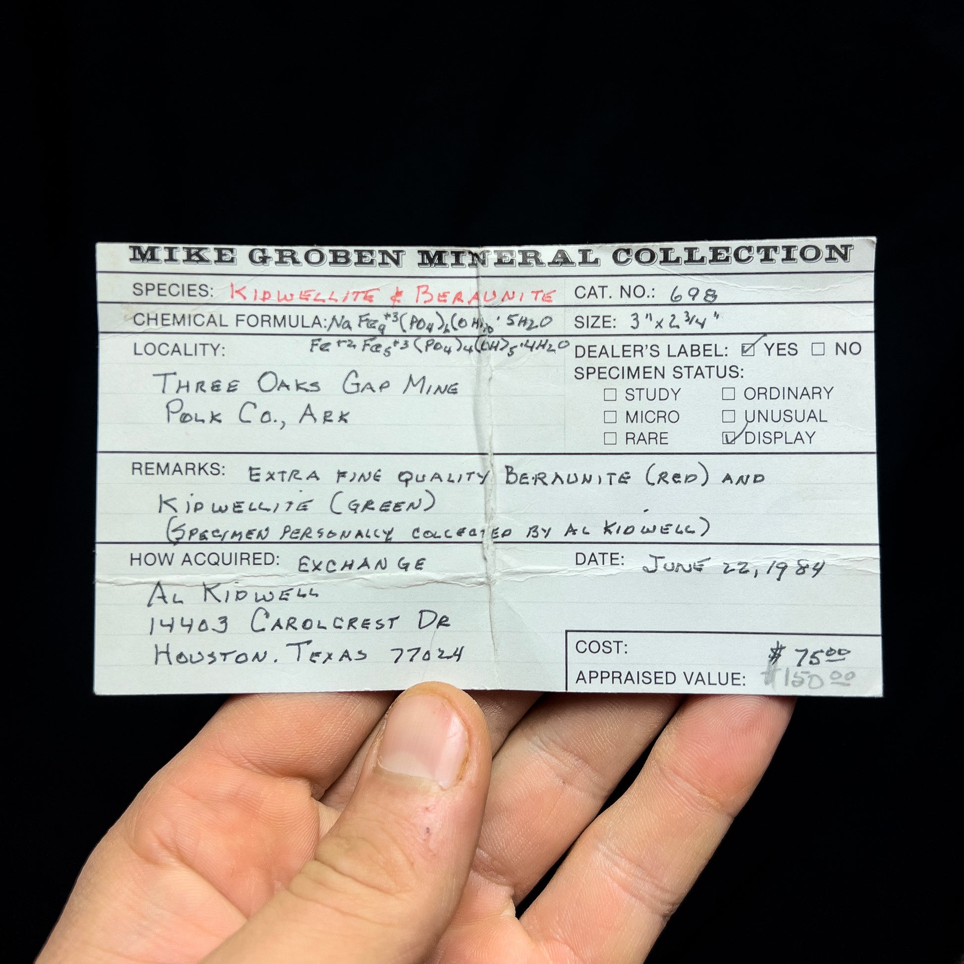 A very nice kidwellite with beraunite from the Three Oaks Gap Mine, in Polk Co., Arkansas. This specimen was collected by Al Kidwell, who first discovered the species in Montgomery County in the 1970s. Kidwellite is a very rare phosphate found in the novaculite deposits of the Quachita Mountains in Arkansas, as well as numerous other localities across the world. This specimen features a generous coverage of green kidwellite with dark burgundy beraunite that has formed over a bit of matrix. The kidwellite shows varying shades of green, while the beraunite is unusually well crystallized for the species. The specimen hails from the collection of Mike Groben, who acquired the piece in 1984 via a trade with A.L. Kidwell. It is in fine condition with no significant damage worth reporting, and comes with a custom acrylic base, milled and engraved in house by our master carver, Jacob.