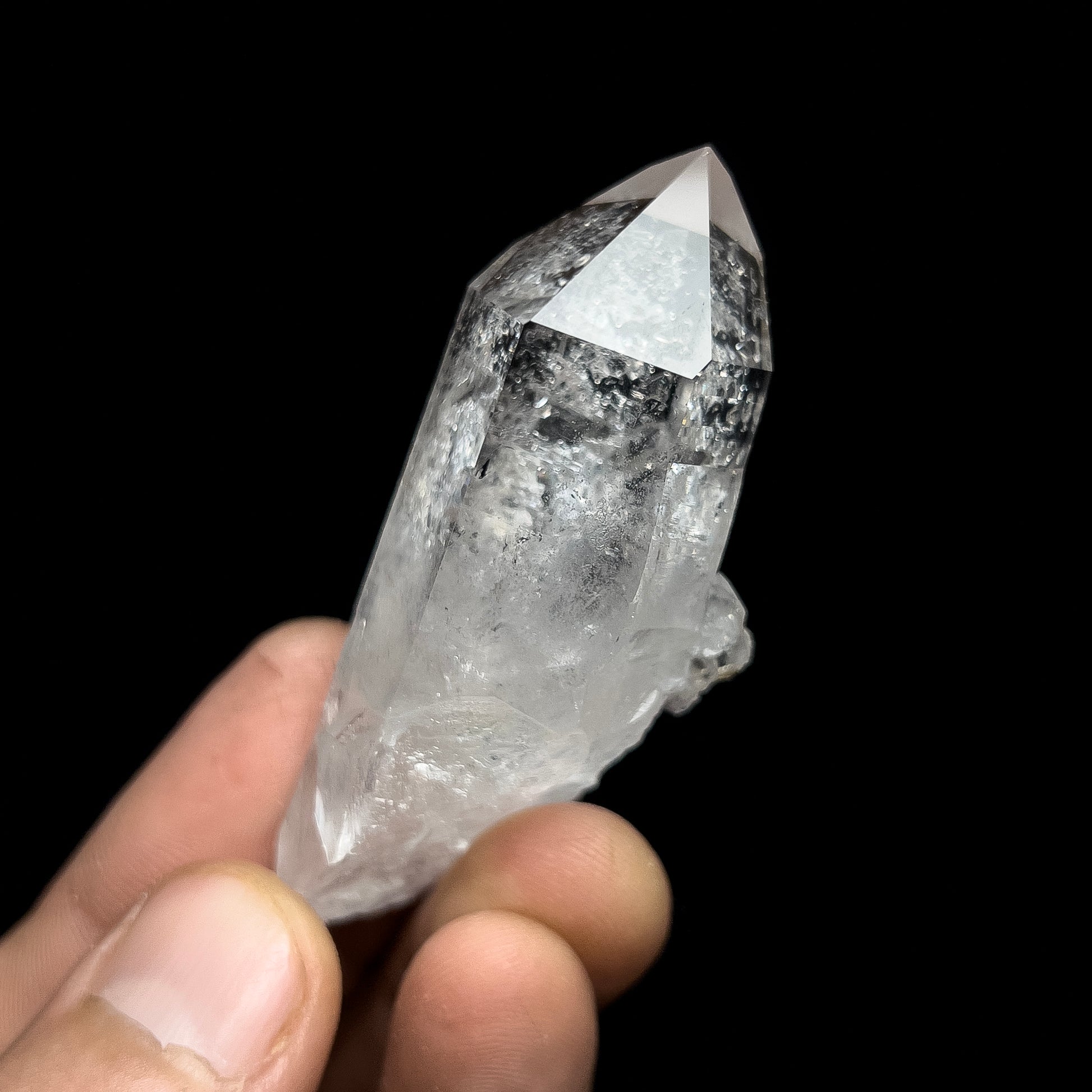 A very nice quartz crystal from I Me Mine, near Jessieville, in Garland Co., Arkansas. This crystal has very high luster and great clarity. A multitude of small crystals formed on one prism face, while the others are smooth - these small crystals cause some beautiful internal rainbows. The crystal is in great condition with no significant damage worth mentioning.