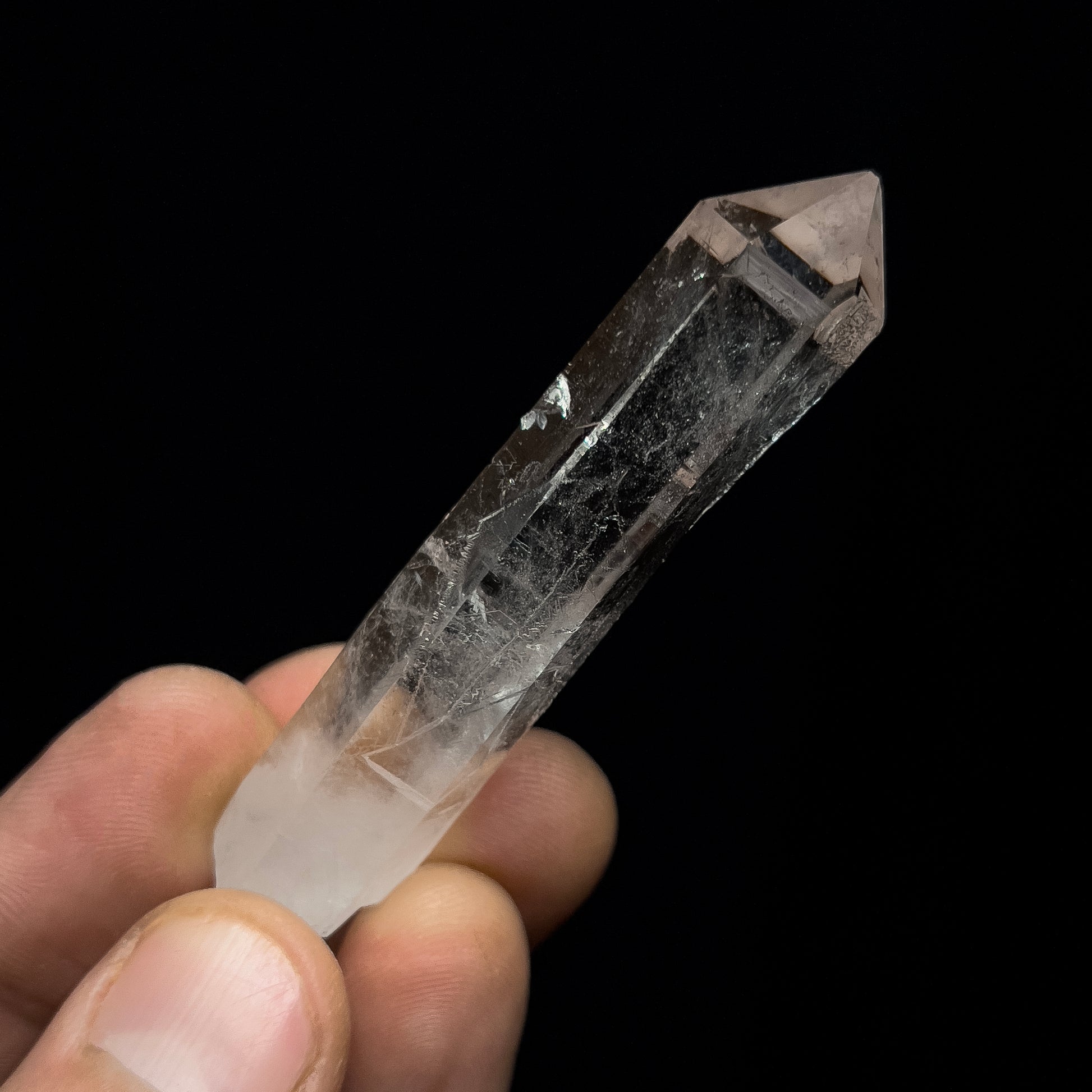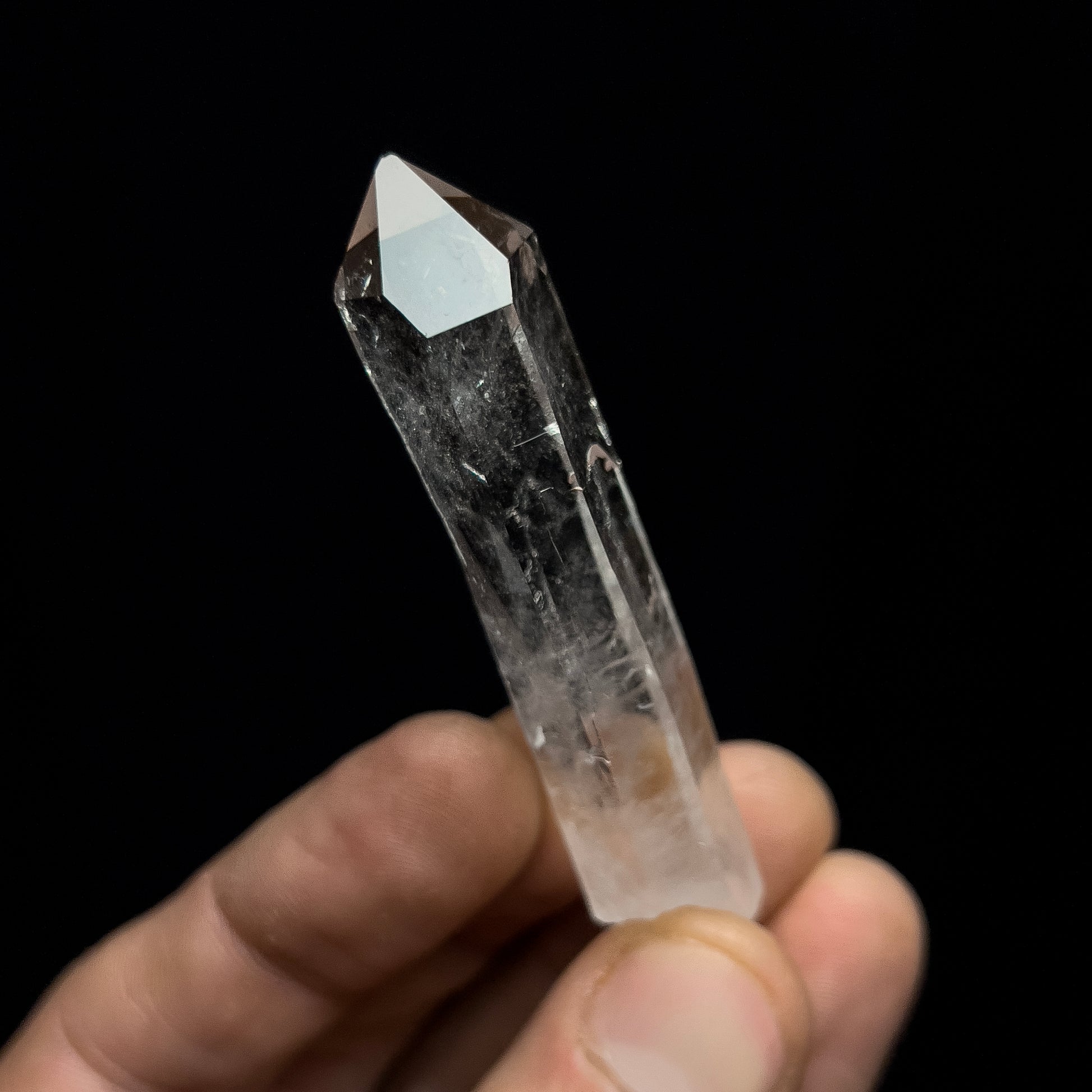 A lovely quartz crystal from I Me Mine, near Jessieville, in Garland Co., Arkansas. This crystal has very high luster and exceptional clarity. It has a brightness to it that only the very best have. It has two large contacts on the backside that show light recrystallization. There are no other issues or damage worth reporting.