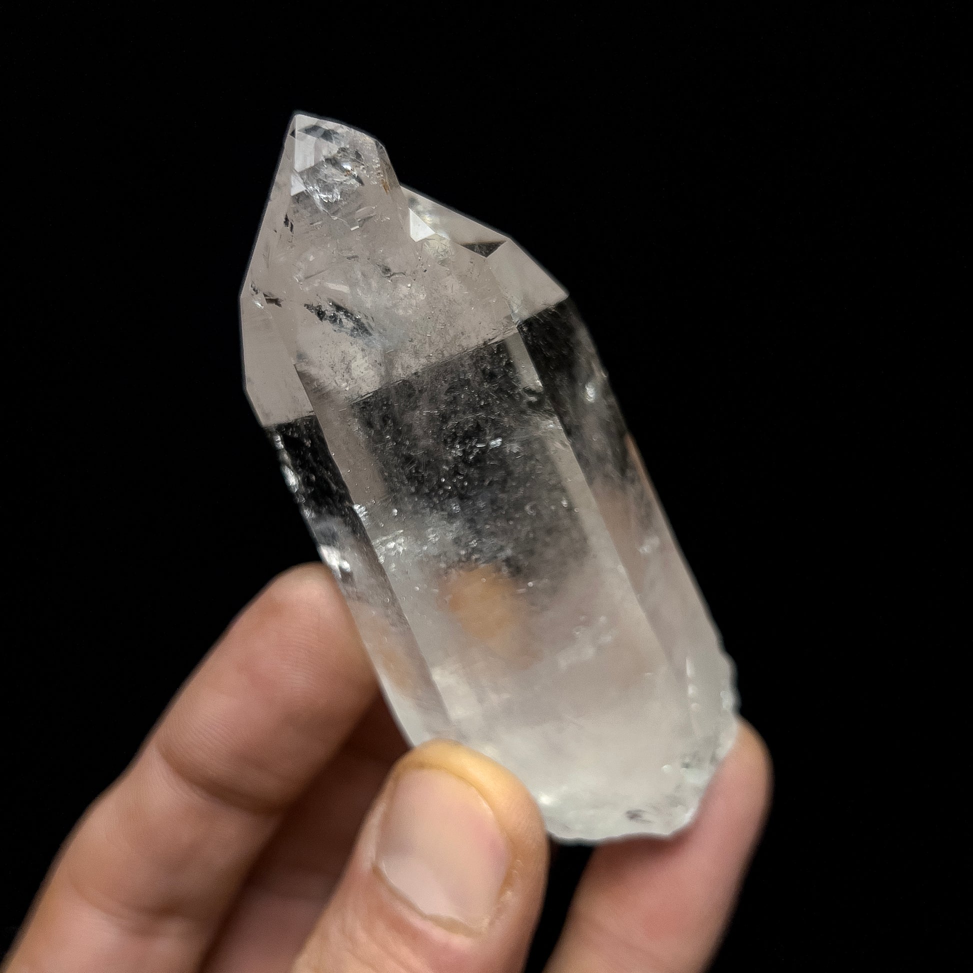 A superb quartz crystal from I Me Mine, near Jessieville, in Garland Co., Arkansas. This crystal has very high luster and exceptional clarity. It exhibits dramatic parallel growth at the tip where two terminations are intergrown and share prism faces. There is some minor wear on some of the edges but no other damage worth mentioning. Custom mounting is available at checkout.