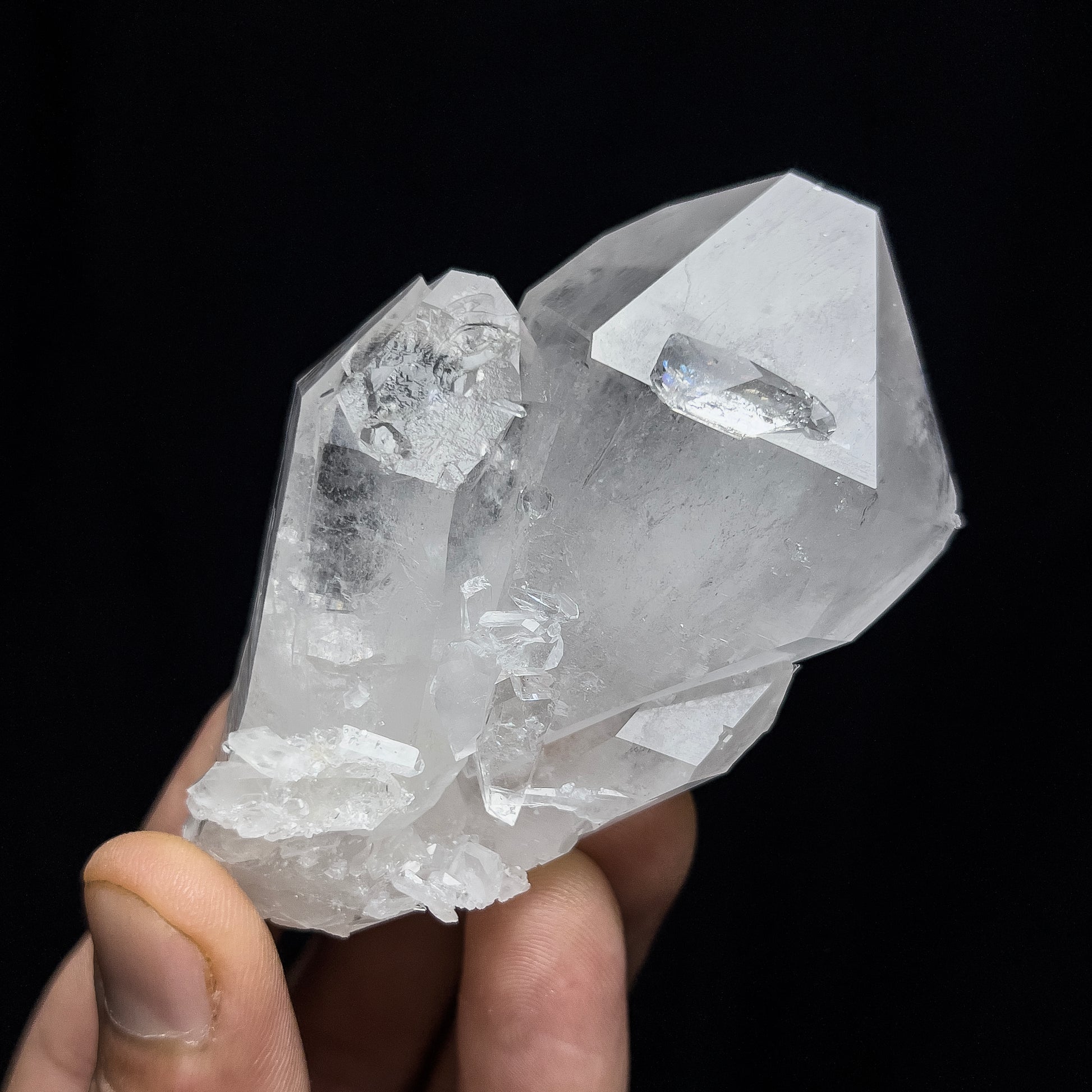 A very interesting quartz crystal from I Me Mine, near Jessieville, in Garland Co., Arkansas. This is a complex doubly terminated crystal that clearly experienced significant stress and disruption in the pocket while the mineralizing solution was still present - indicated by the large, recrystallized faces. Both of the large crystals show parallel growth, where multiple terminations share prism faces. The specimen developed as a floater, meaning it is completely crystallized all the way around. It is in good condition with no significant damage worth mentioning.