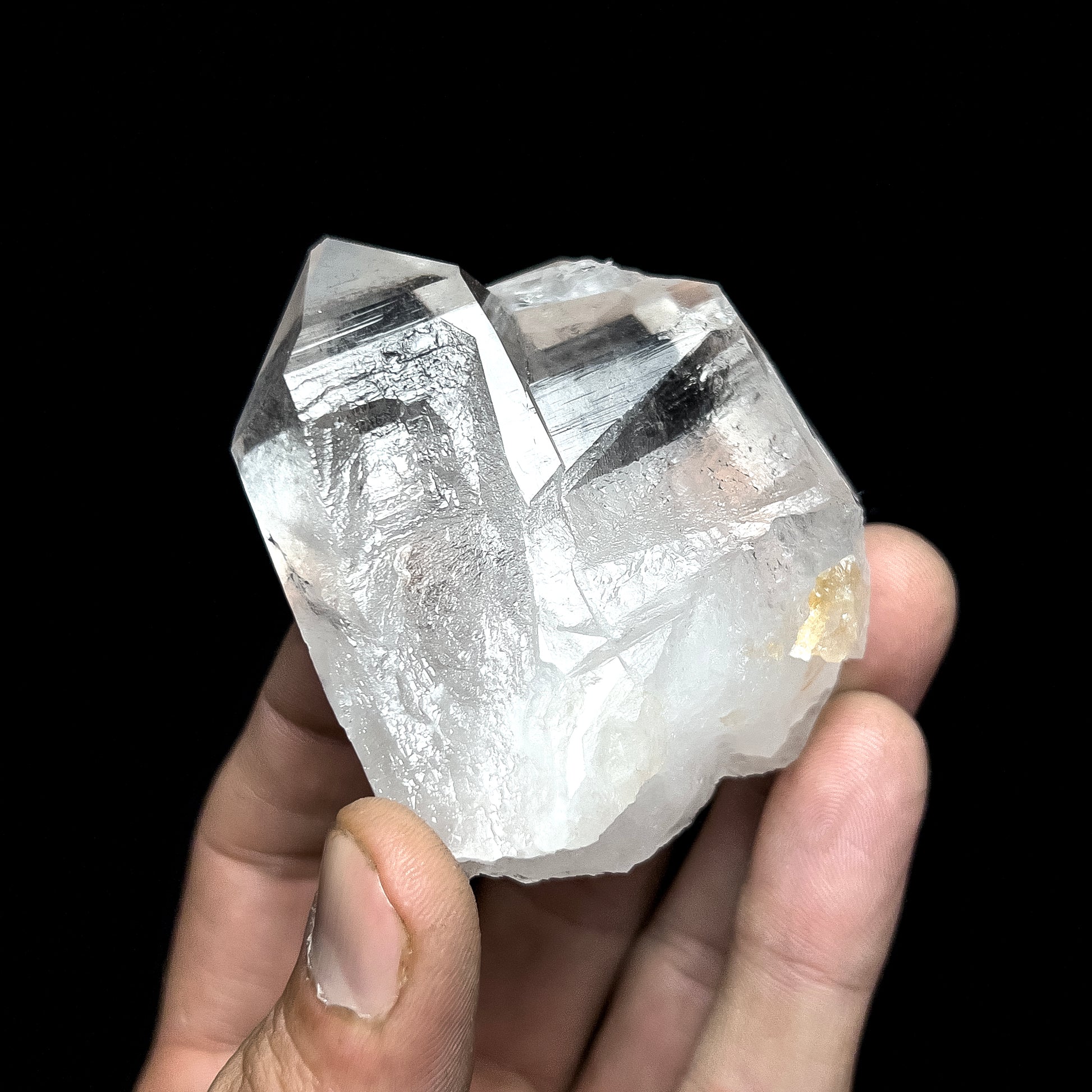 A beautiful quartz crystal from I Me Mine, near Jessieville, in Garland Co., Arkansas. This specimen is comprised of two crystals in parallel growth. They both have exceptional luster and good clarity. The prism faces show fine striations, while the terminal faces exhibit geometric growth hillocks. There is a contact/recrystallized area on one of the front prism faces that shows complex geometry; the backside also shows contacted and lightly recrystallized areas. There is a tiny ding (<1mm) on one termination, as well as a small chip on one of the back edges. Custom mounting is available at checkout.