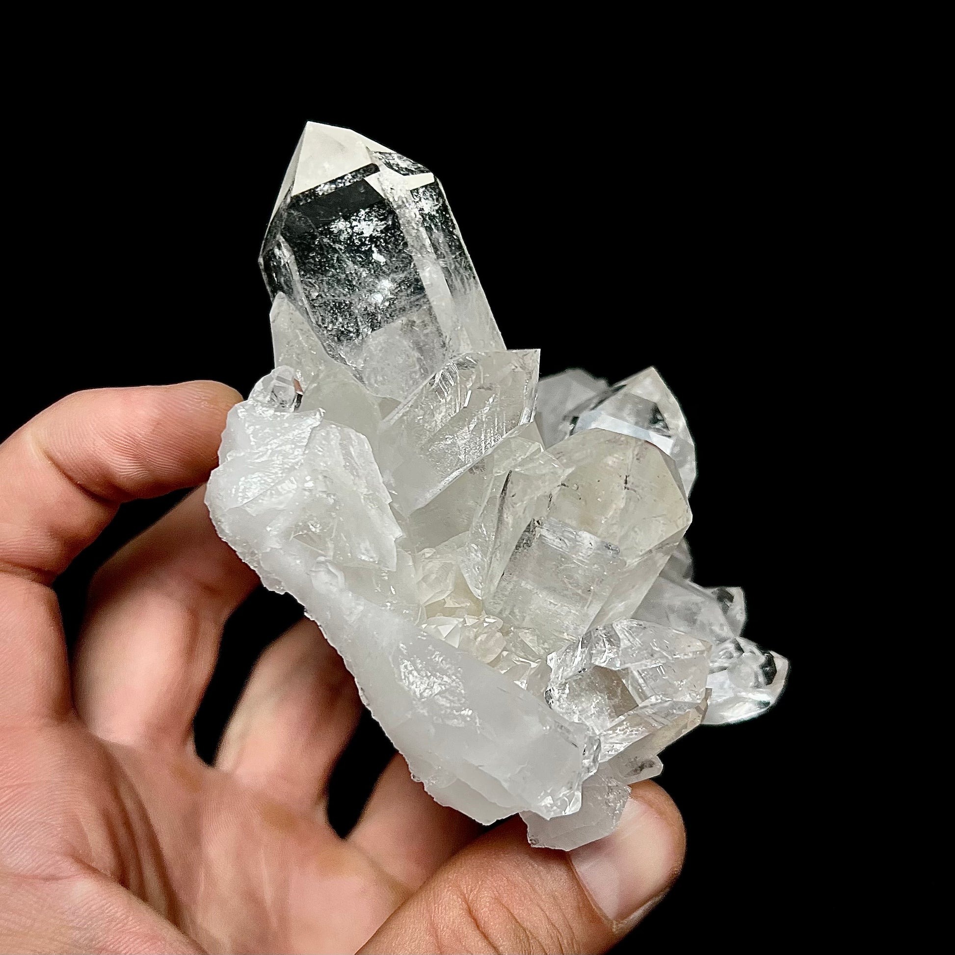A fantastic quartz cluster from I Me Mine, near Jessieville, Arkansas. This specimen features three prominent crystals that originate at a common center, creating a spray aesthetic that is very attractive. The crystals are gemmy and have high luster - and while there are some contacts around the edges, the specimen has no significant damage. It comes with a custom milled and engraved acrylic mount - made in house by our master carver.