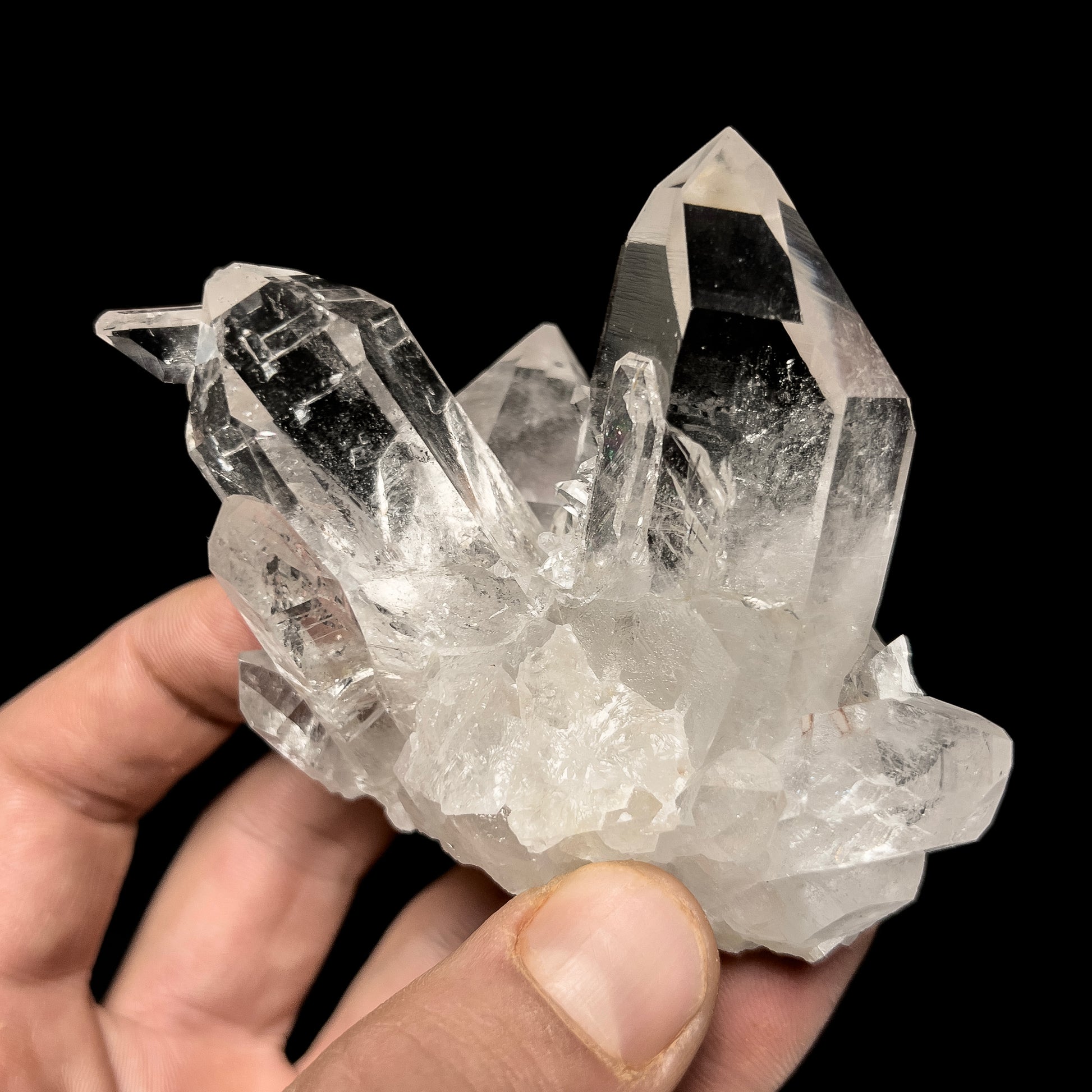 An exceptional quartz crystal cluster from I Me Mine, near Jessieville, Arkansas. This cluster features two prominent, transparent crystals that have formed in a V-shaped arrangement. Several other quartz crystals of various sizes adorn the specimen, accentuating the two focal crystals nicely. Both of the main crystals have black inclusions that form faint phantoms (presumably carbon). There is one missing crystal in the front, as seen in the photos - aside from this there are no other issues. Custom mounting is available at checkout.