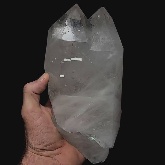 A huge double-terminated quartz crystal from I Me Mine, near Jessieville, Arkansas. This crystal weighs over 6 lbs and is about the size of a football. It is completely crystallized all around - 360 degrees of sharp edges and mirror-like faces. It has some gemmy sections near the main termination, while the lower terminal end shows dramatic and complex recrystallization. The bottom of the crystal experienced major stress and disruption in the pocket and completely sheared off from the main crystal but recrystallized back to its parent crystal at an offset angle. Super cool! The piece has a pale - but natural - smoky hue and there is no significant damage to report. Custom mounting is available at checkout.
