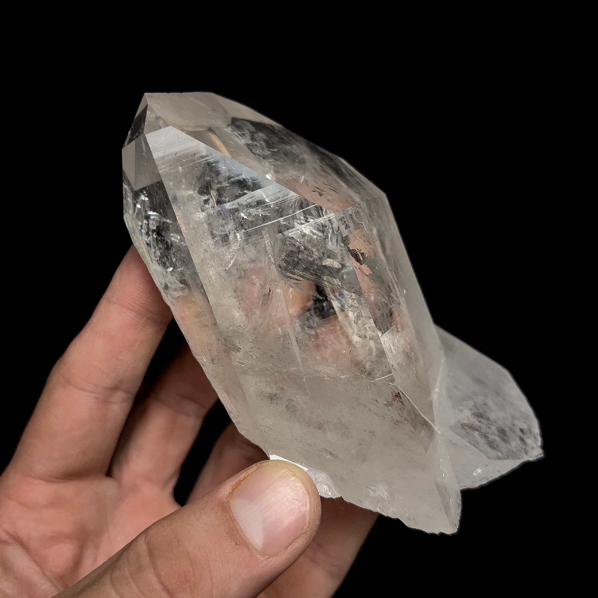 A very nice quartz crystal from I Me Mine, near Jessieville, Arkansas. This chunky crystal has nice luster, good internal clarity and rainbows, sharp edges and a chisel-tip style termination. The backside and bottom are lightly recrystallized making the piece a "floater". There is an area near the bottom left where a portion of the crystal sheared off in the pocket and reattached itself via recrystallization. There is a little chip to the smaller crystal at the bottom of the piece, but the specimen is in good condition otherwise. Custom mounting is available at checkout.