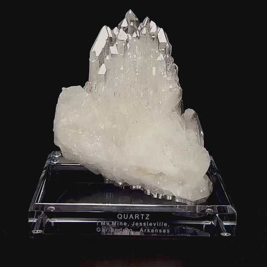This is one of the best examples of recrystallization I have ever seen from anywhere. A large, crystal was twisted and sheared off from geologic upheaval; another solution entered the chamber at some point (or was still present at the time of disruption) and recrystallized the broken areas in a dramatic fashion. Hundreds of slender, gemmy, lustrous quartz points formed in parallel-growth along the previously broken faces to make up this castle-like aesthetic. The bottom and backside are completely recrystallized as well - full on 360-degree piece. There is one minor area where a small termination is missing but no other significant is worth reporting. It comes with a custom acrylic mount, made in-house, to maximize display potential.