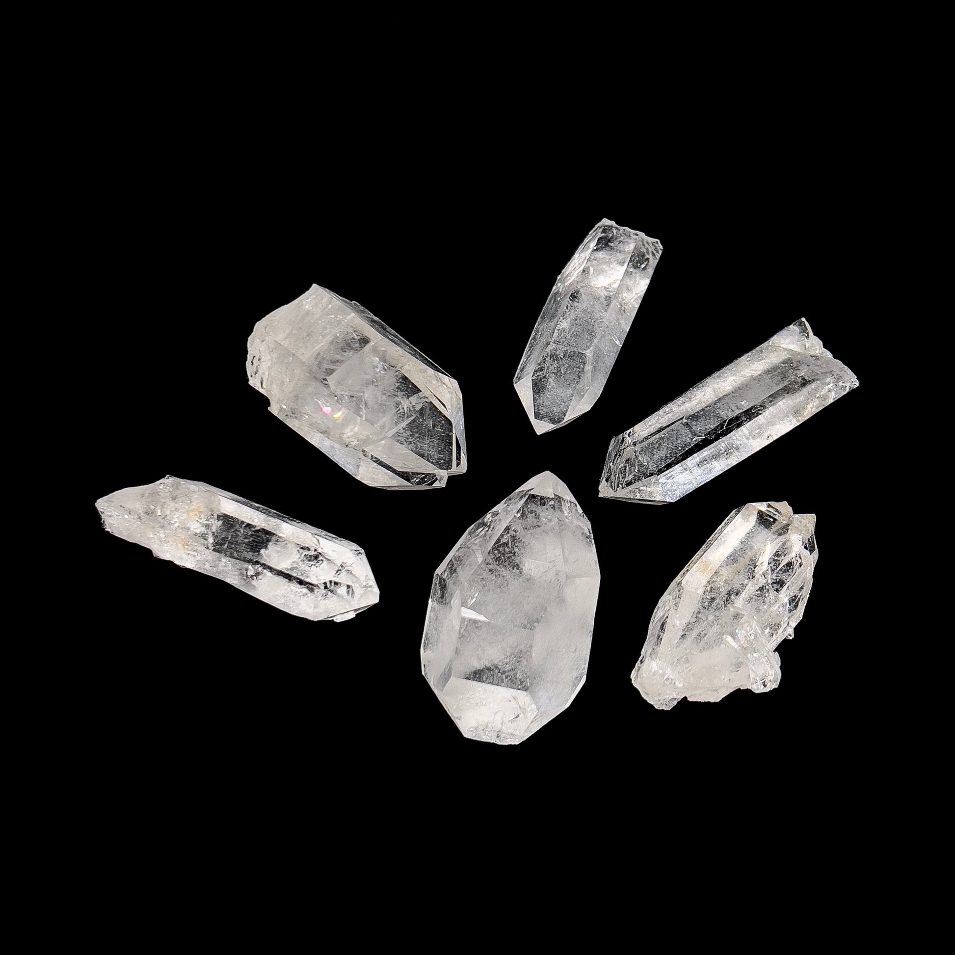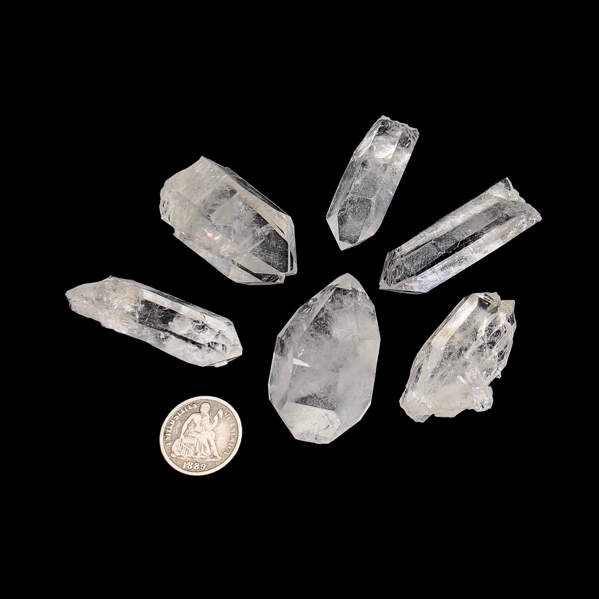 A group of six clear quartz crystals from I Me Mine, near Jessieville, Arkansas. This parcel consists of 6 small gemmy points. Each crystal is unique.