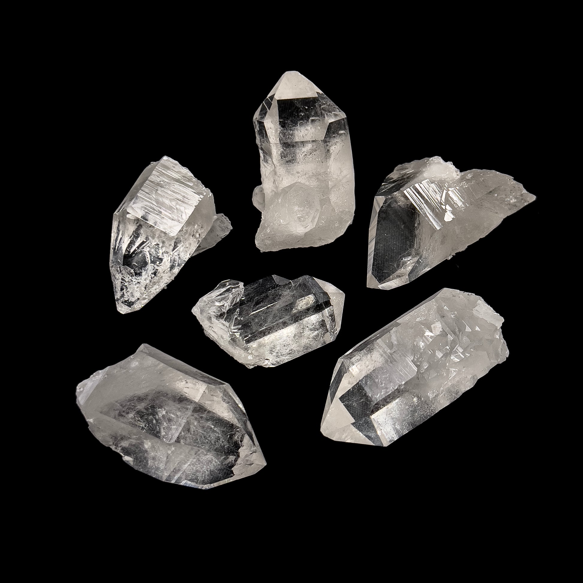 A group of six small quartz crystals from I Me Mine, near Jessieville, Arkansas. This parcel consists of six clear quartz crystals of various sizes and shapes. Each crystal is unique.