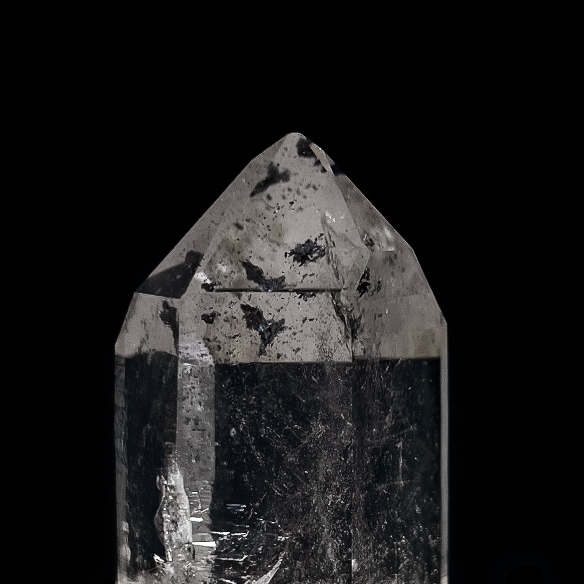 A very fine quartz crystal with black inclusions from I Me Mine, near Jessieville, Arkansas. This crystal has exceptional luster and internal clarity - it also hosts black inclusions near the termination (presumably carbon). The inclusions do form a phantom, but the shape of the phantom is not immediately obvious. There is contacted area on the backside that is lightly recrystallized, but the crystal has no significant damage. Custom mounting is available at checkout.
