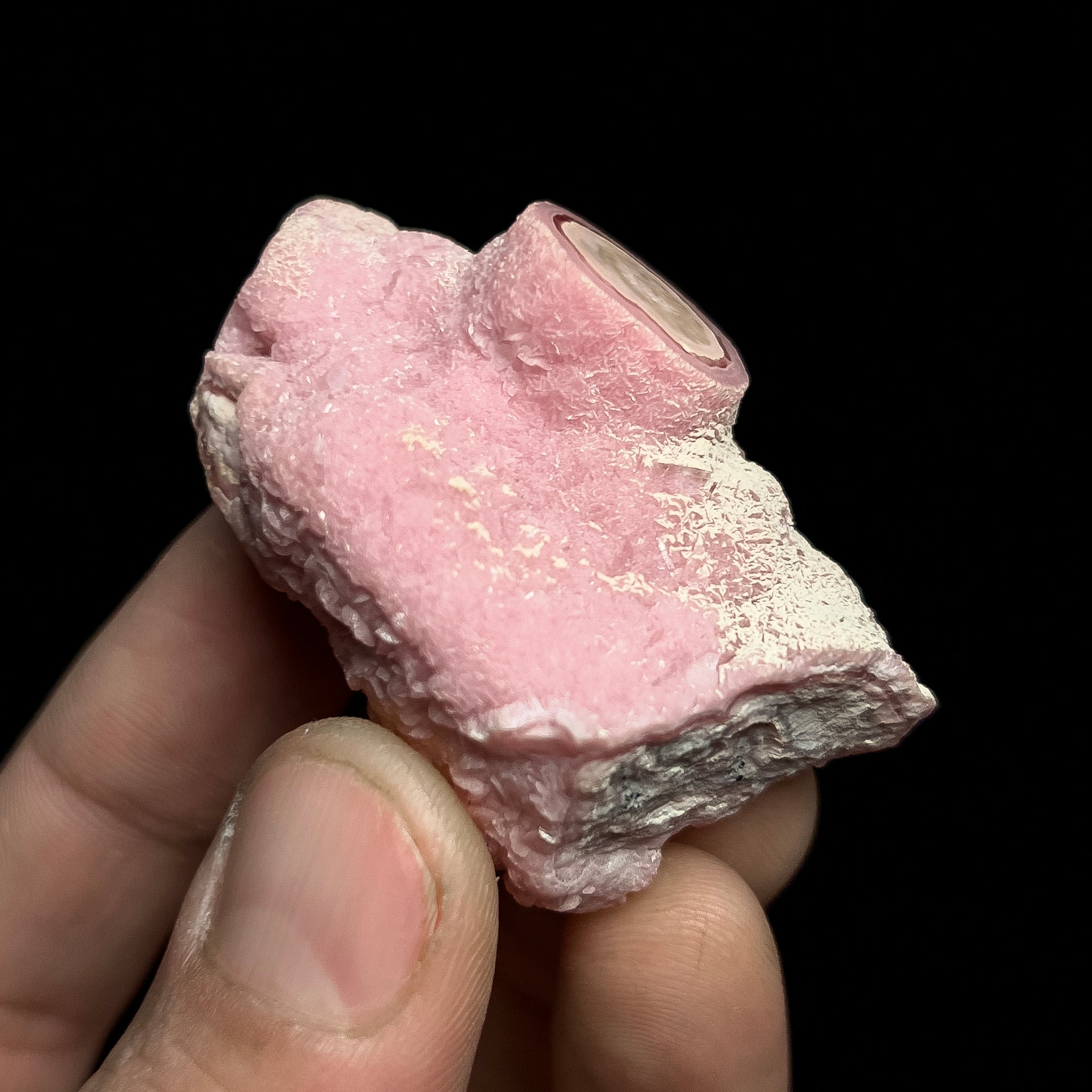 A beautiful rhodochrosite from the Capillitas mining district, in the Catamarca Province of Argentina. This material is well-known amongst collectors, as this is the only locality in the world that produces these banded stalactites and concretions of layered rhodochrosite. It is stunning when cut and polished, often showing beautiful patterns and layered growth - much like the rings on the cross section of a tree. This specimen features a rich coverage of pink rhodochrosite. A stalactite grew right in the center of the specimen and was later sawn and polished in cross-section, revealing the gorgeous multi-colored layers of rhodochrosite. Some larger rhombohedral crystals can be seen on the backside, and the specimen is in good condition. Custom mounting is available at checkout.