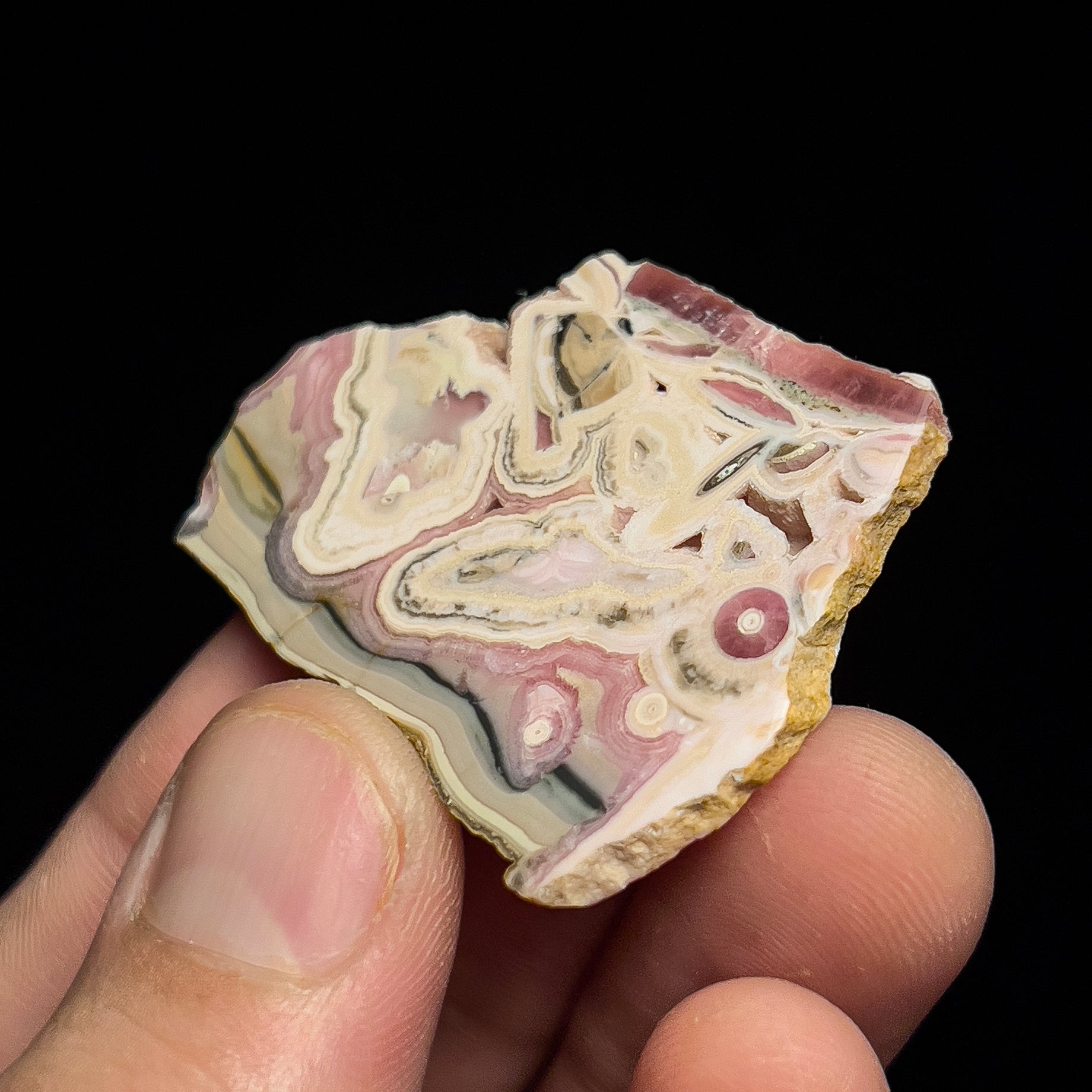 This particular example is a thin slice. It has been slabbed on a lapidary saw and polished on both sides to reveal a beautiful pattern of banded rhodochrosite in many hues of pink and white. Some black manganese oxides really accentuate the piece and add a dramatic splash of contrast. It is thin enough that light passes through the red areas which makes the specimen appear to glow. There is no significant damage.