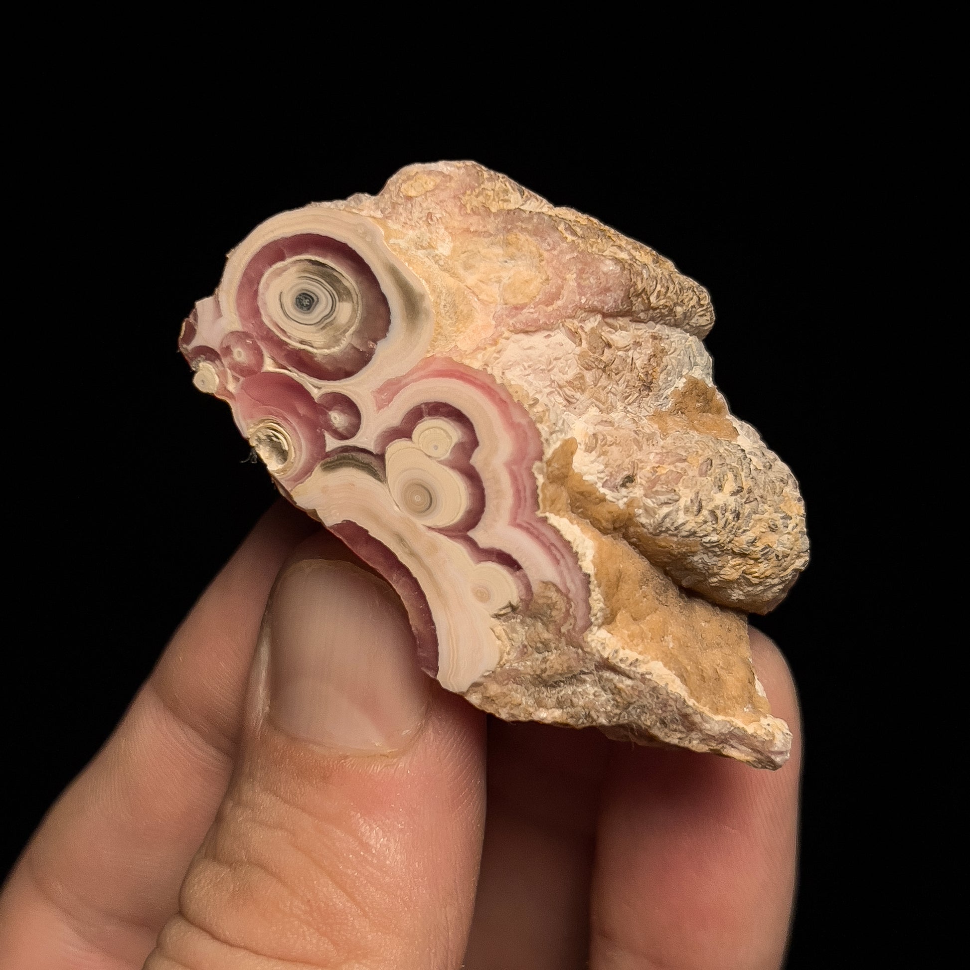 A beautiful rhodochrosite from the Capillitas mining district, in the Catamarca Province of Argentina. This material is well-known amongst collectors, as this is the only locality in the world that produces these banded stalactites and concretions of layered rhodochrosite. It is known colloquially as "Inca Rose", although there is no evidence to support that the deposit was exploited so long ago. It first appears in the literature in 1873, though natives likely mined the placer deposits for gold in pre-Colombian times. It is stunning when cut and polished, often showing beautiful patterns and layered growth - much like the rings on the cross section of a tree.Β