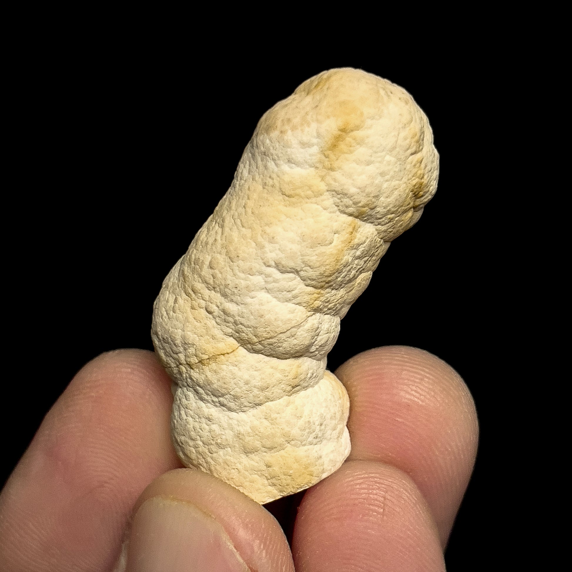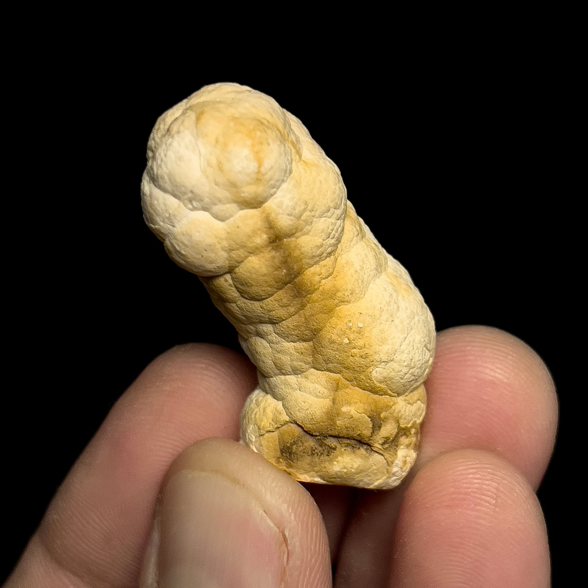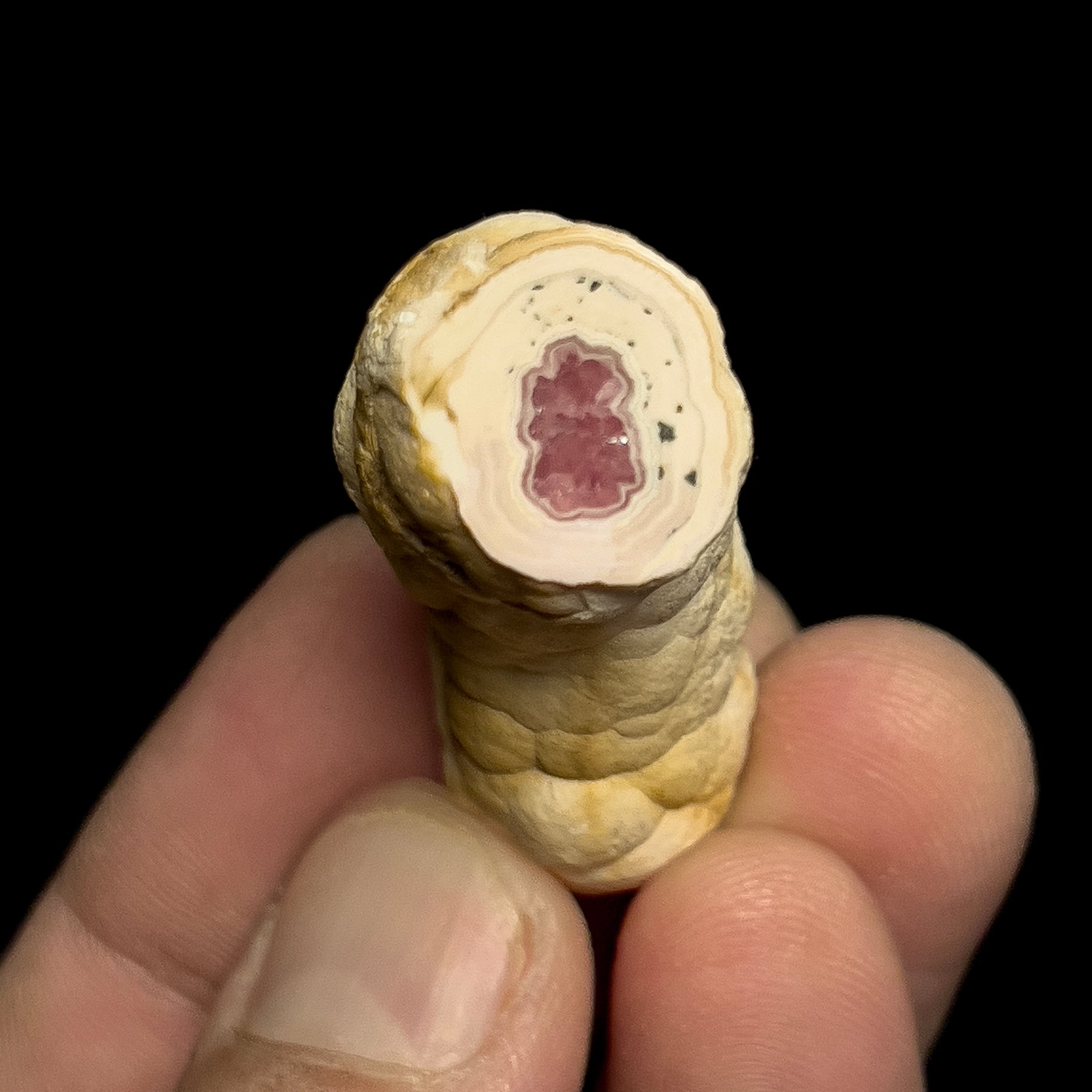 This one is a nice example of single elongated stalactite - its bubbly rind an off-white color with a staining of iron oxides, while its inner core is vivid red, gemmy rhodochrosite surrounded by further off-white generations. The bottom has been sliced and polished to reveal these layers, leaving the "terminal" end intact. The specimen is in good condition, with no significant damage to report.