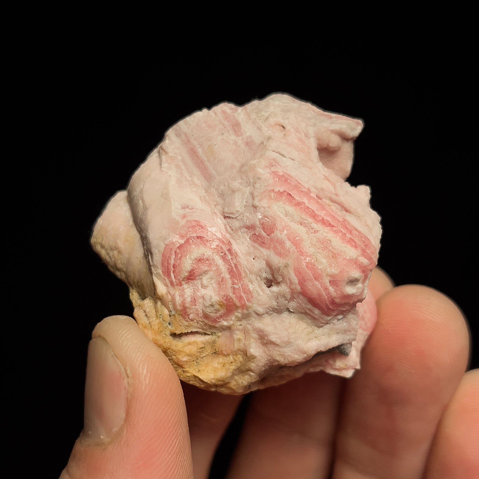 A beautiful rhodochrosite from the Capillitas mining district, in the Catamarca Province of Argentina. This material is well-known amongst collectors, as this is the only locality in the world that produces these banded stalactites and concretions of layered rhodochrosite. It is known colloquially as "Inca Rose", although there is no evidence to support that the deposit was exploited so long ago. It first appears in the literature in 1873, though natives likely mined the placer deposits for gold in pre-Colombian times. It is stunning when cut and polished, often showing beautiful patterns and layered growth - much like the rings on the cross section of a tree.Β