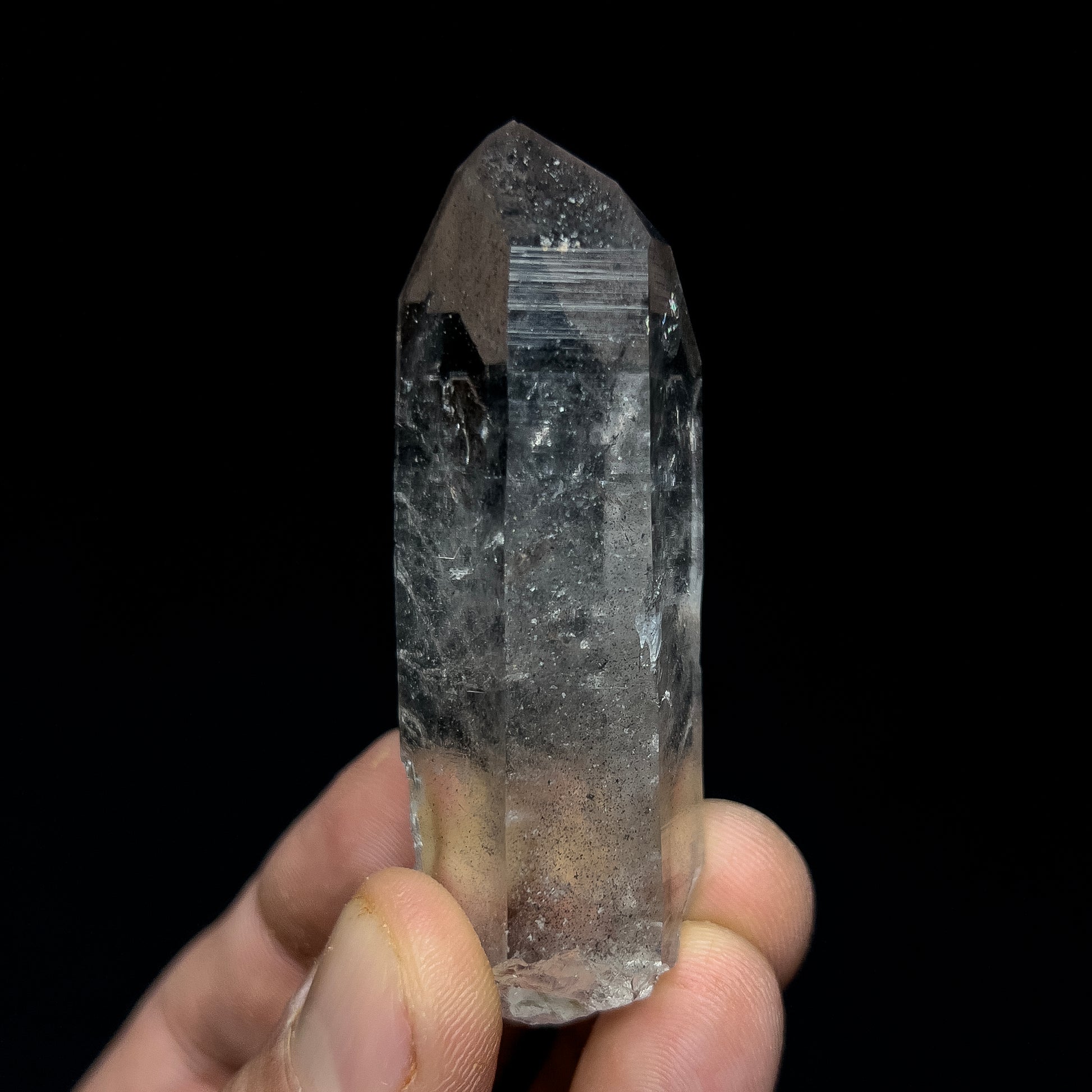 A very fine, light smoky quartz crystal with black inclusions from I Me Mine, near Jessieville, Arkansas. This crystal has a natural light grey hue to it and hosts black inclusions (presumably carbon) trapped just below the surface of the one of the back terminal faces. The luster is mirror-like, and the crystal has great transparency. There are two very minor dings (<1mm) on the edges and some contacting near the bottom but overall, the piece is in good condition. Custom mounting is available at checkout.