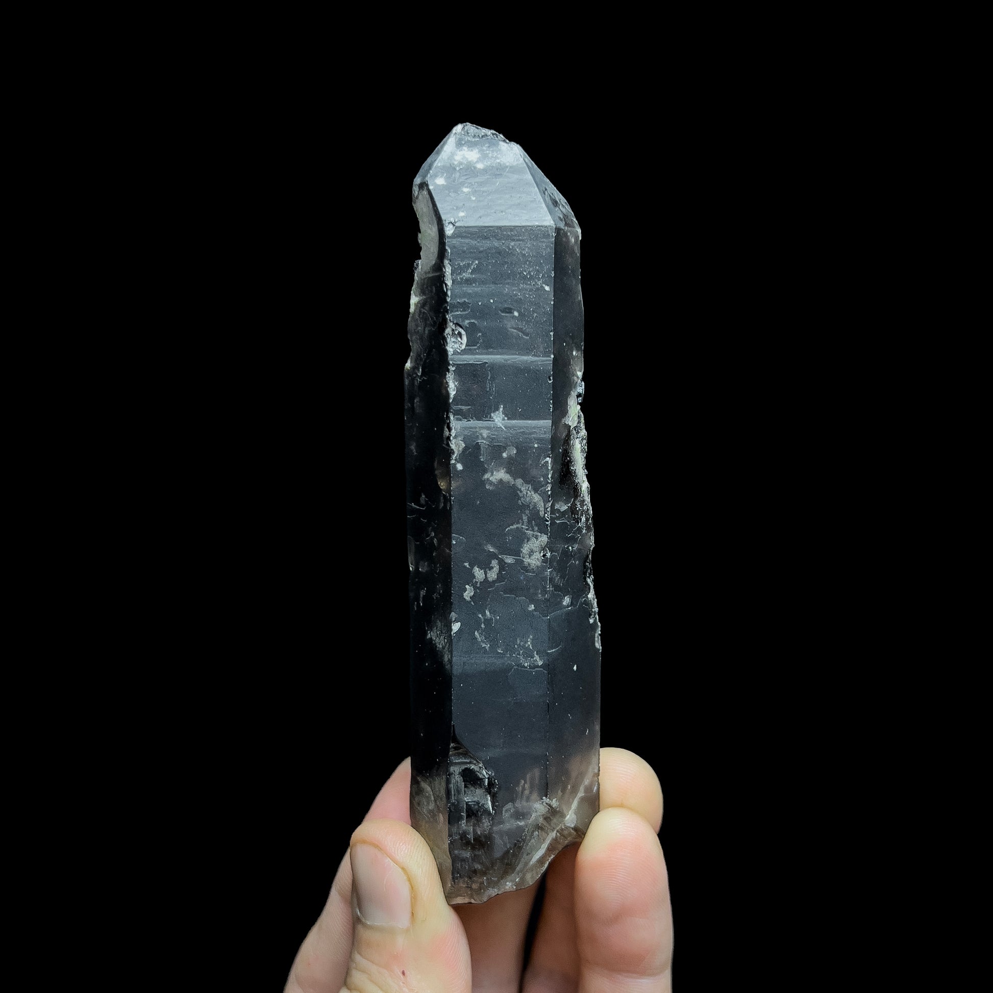 A large smoky quartz crystal with brookite crystals from older finds at Magnet Cove, in Hot Spring Co., Arkansas. This is a large single crystal for the locality with good gemmy sections that exhibit a chocolate brownish color when backlit. Numerous small brookite crystals adorn several faces. The specimen is in fair condition overall - the termination isn't perfect but it appears to be old damage, not extraction damage. It comes with a custom acrylic base, milled and engraved in house by our master carver, Jacob.
