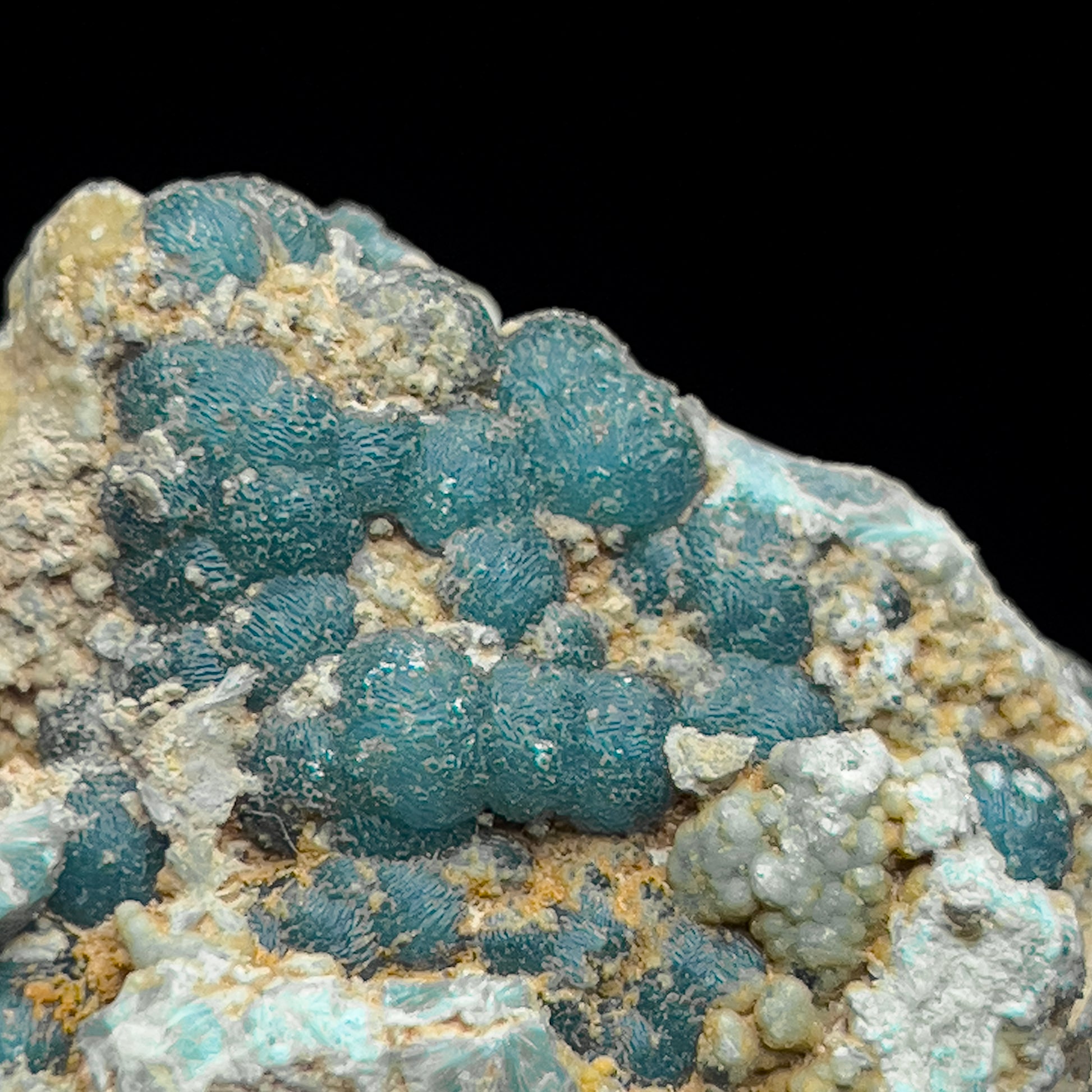A beautiful blue wavellite from Mauldin Mountain, in Montgomery Co., Arkansas. This find is distinctive from other finds of blue wavellite - whereas is a late-stage growth over green wavellite spheres, this find is true blue to the core. Broken radial sprays show blue coloration throughout, indicating there never was a green stage. This piece has exceptional color and luster for the find. It shows good botryoids (spheres) that are somewhat isolated on a bit of matrix. There is a second group of wavellite crystals on the backside as well. Unfortunately, there are some damaged crystals, but they actually add to the specimen in my opinion - they allow you to see the radial sprays of wavellite crystals that make up the spherical aggregates.